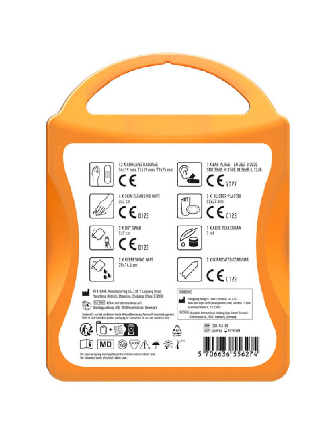 Kit ideal para cualquier festival. Con este kit estarás preparado para cualquier momento del festival. Contenido: 12 apósitos adhesivos resistentes al agua, 4 toallitas limpiadoras, 2 toallitas secas, 2 toallitas refrescantes, 2 preservativos, 2 adhesivos para ampollas, 1 crema aloe vera, 2 tapones oídos. Todos los complementos de primeros auxilios cumplen todas las normativas de la UE. El precio incluye impresión a todo color en la etiqueta.