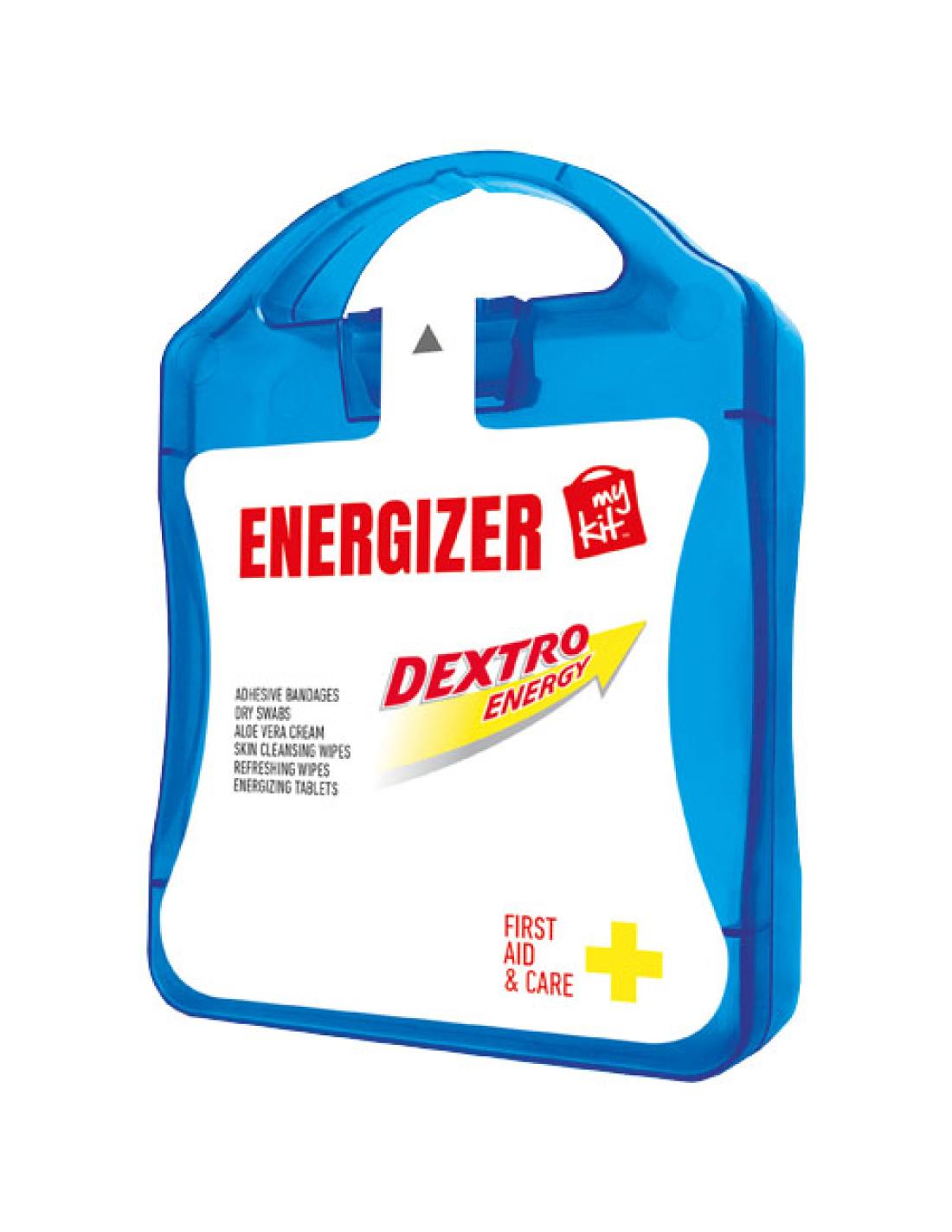 Kit ideal para darte energía. Con este kit podrás refrescarte y energizarte además de estar preparado para pequeños accidentes o heridas. Contenido: 12 apósitos adhesivos resistentes al agua, 2 2 packs de tabletas energéticas (4uds), 1 toallita refrescante, 1 aloe vera, 4 toallitas limpiadoras, 2 toallitas secas. Todos los complementos de primeros auxilios cumplen todas las normativas de la UE. El precio incluye impresión a todo color en la etiqueta.