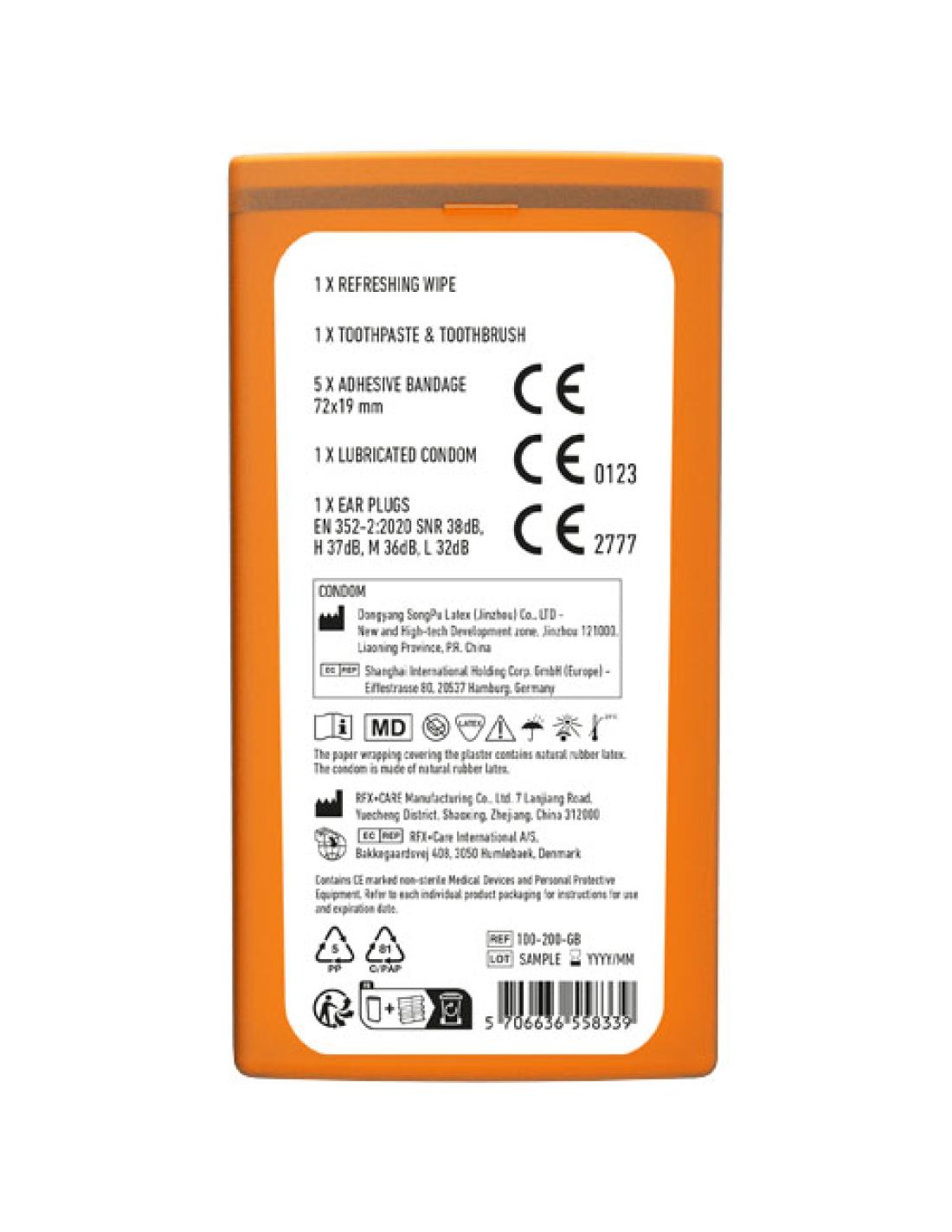 Kit de viaje ideal para festivales y pasar la noche en ellos. El tamaño del kit es ideal para llevarlo encima. Contenido: 1 cepillo de dientes, 1 pasta de dientes, 1 tapones oídos, 1 gel de desinfección, 5 apósitos adhesivos resistentes al agua, 1 preserevativo. Todos los complementos de primeros auxilios cumplen todas las normativas de la UE. El precio incluye impresión a todo color en la etiqueta.