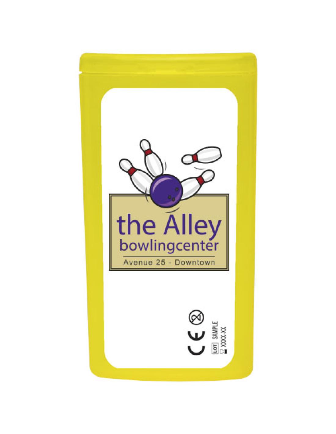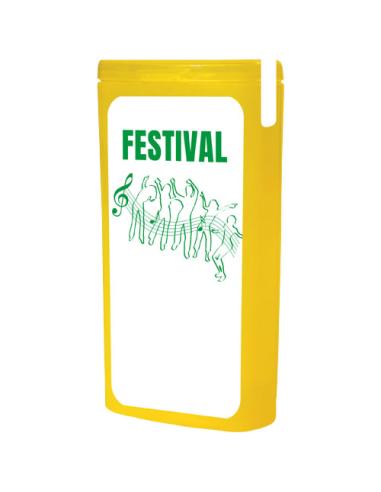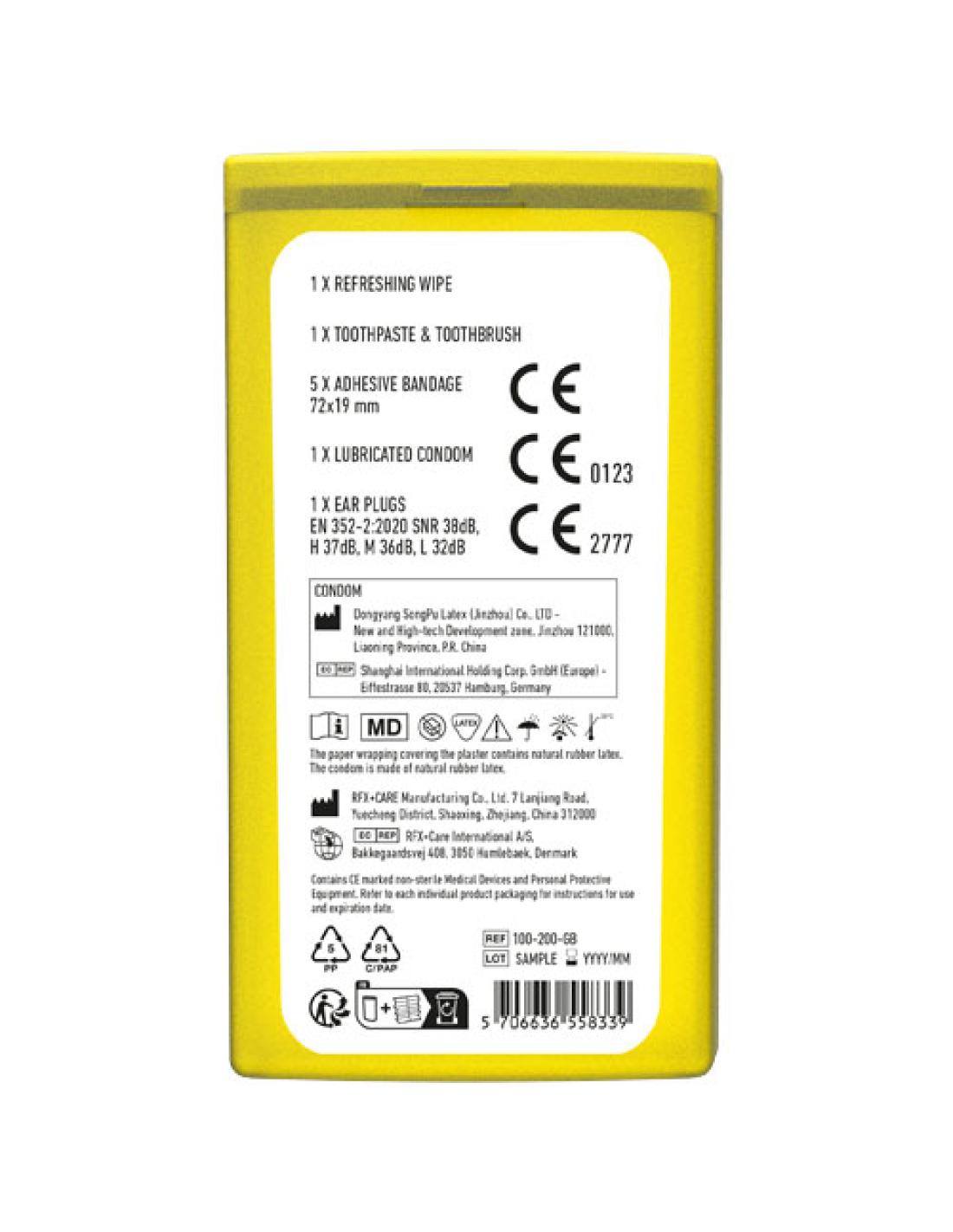 Kit de viaje ideal para festivales y pasar la noche en ellos. El tamaño del kit es ideal para llevarlo encima. Contenido: 1 cepillo de dientes, 1 pasta de dientes, 1 tapones oídos, 1 gel de desinfección, 5 apósitos adhesivos resistentes al agua, 1 preserevativo. Todos los complementos de primeros auxilios cumplen todas las normativas de la UE. El precio incluye impresión a todo color en la etiqueta.