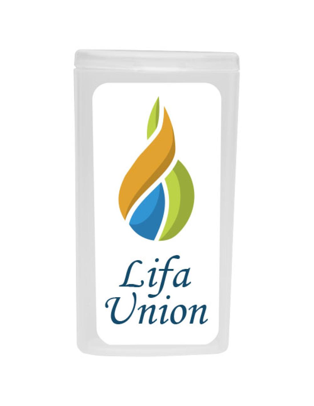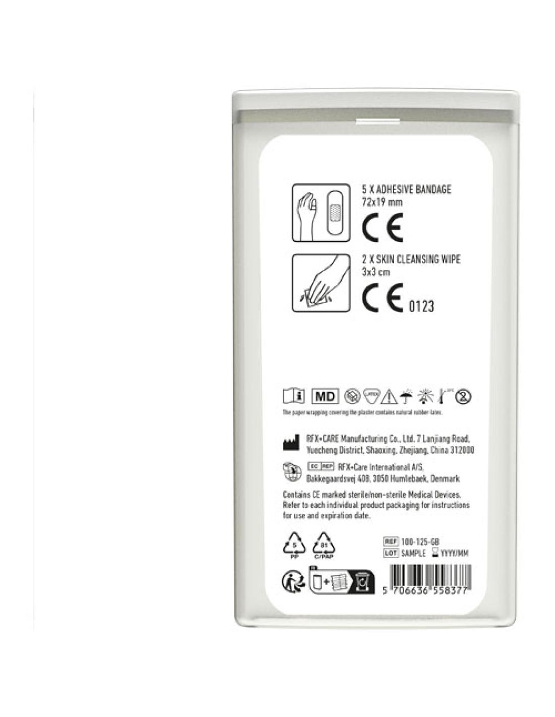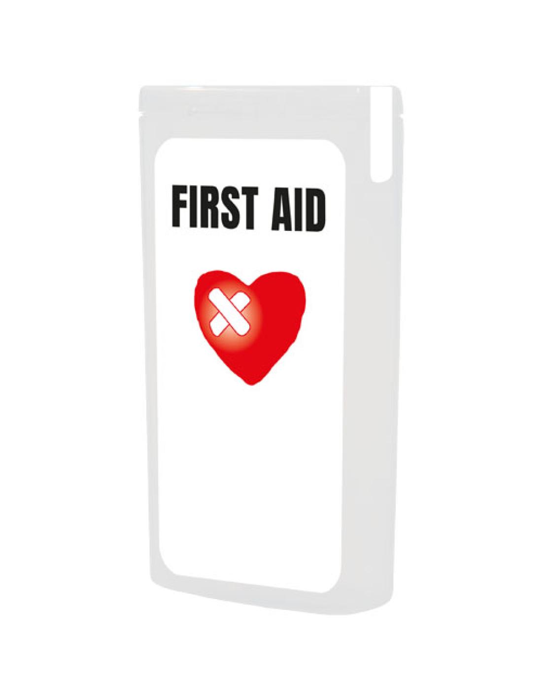 Kit básico de primeros auxilios. Ideal por su tamaño para llevar siempre encima y estar preparado para pequeñas heridas. Contenido: 5 apósitos adhesivos resistentes al agua, 2 toallitas limpiadoras. Todos los complementos de primeros auxilios cumplen todas las normativas de la UE. El precio incluye impresión a todo color en la etiqueta.
