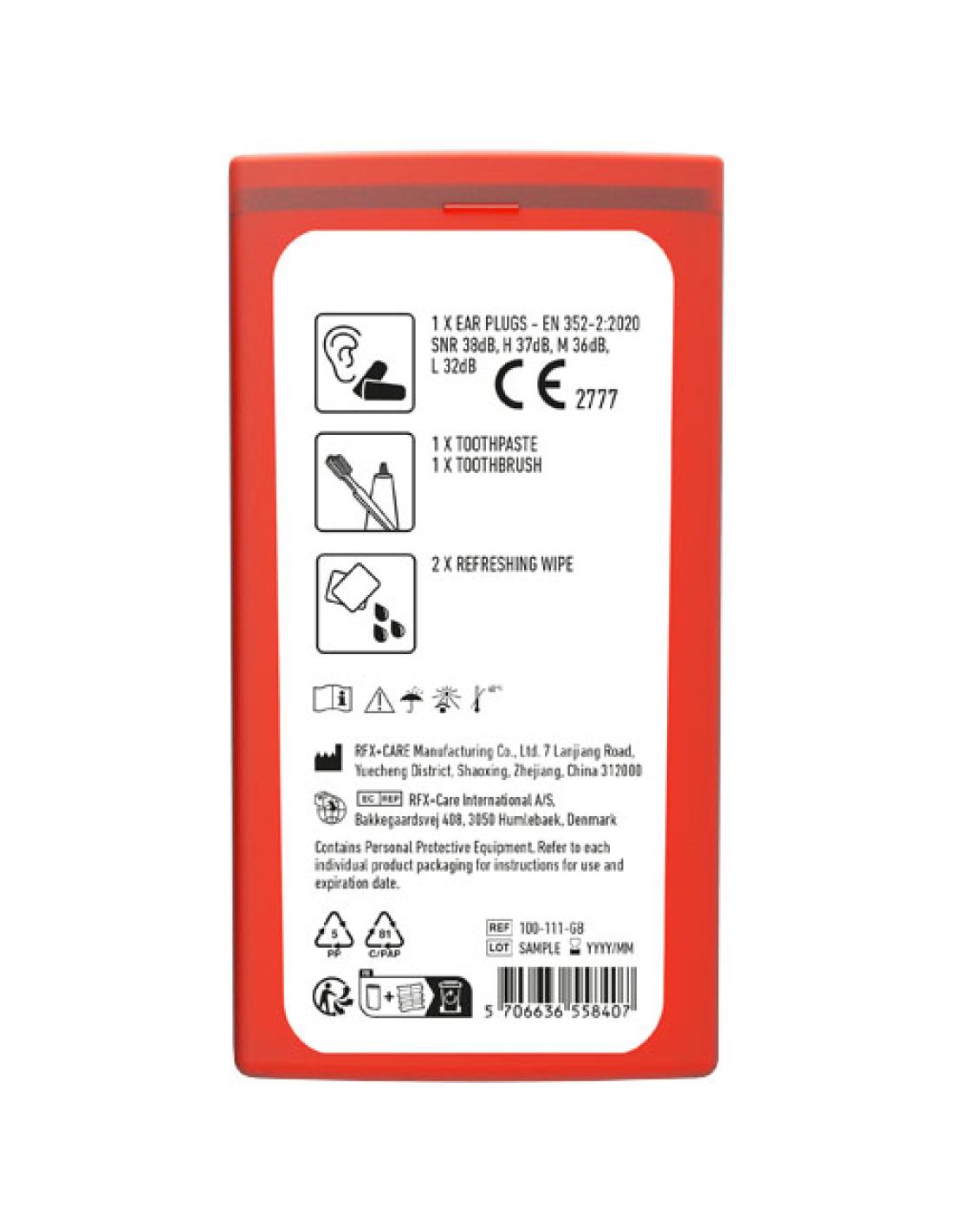 Kit ideal para llevar en cualquier viaje y poder relajarte y refrescarte antes de llegar a tu destino. El tamaño es ideal para llevar siempre encima. Contenido: 1 cepillo de dientes, 1 pasta de dientes, 1 tapones oídos, 2 toallitas refrescantes. Todos los complementos de primeros auxilios cumplen todas las normativas de la UE. El precio incluye impresión a todo color en la etiqueta.