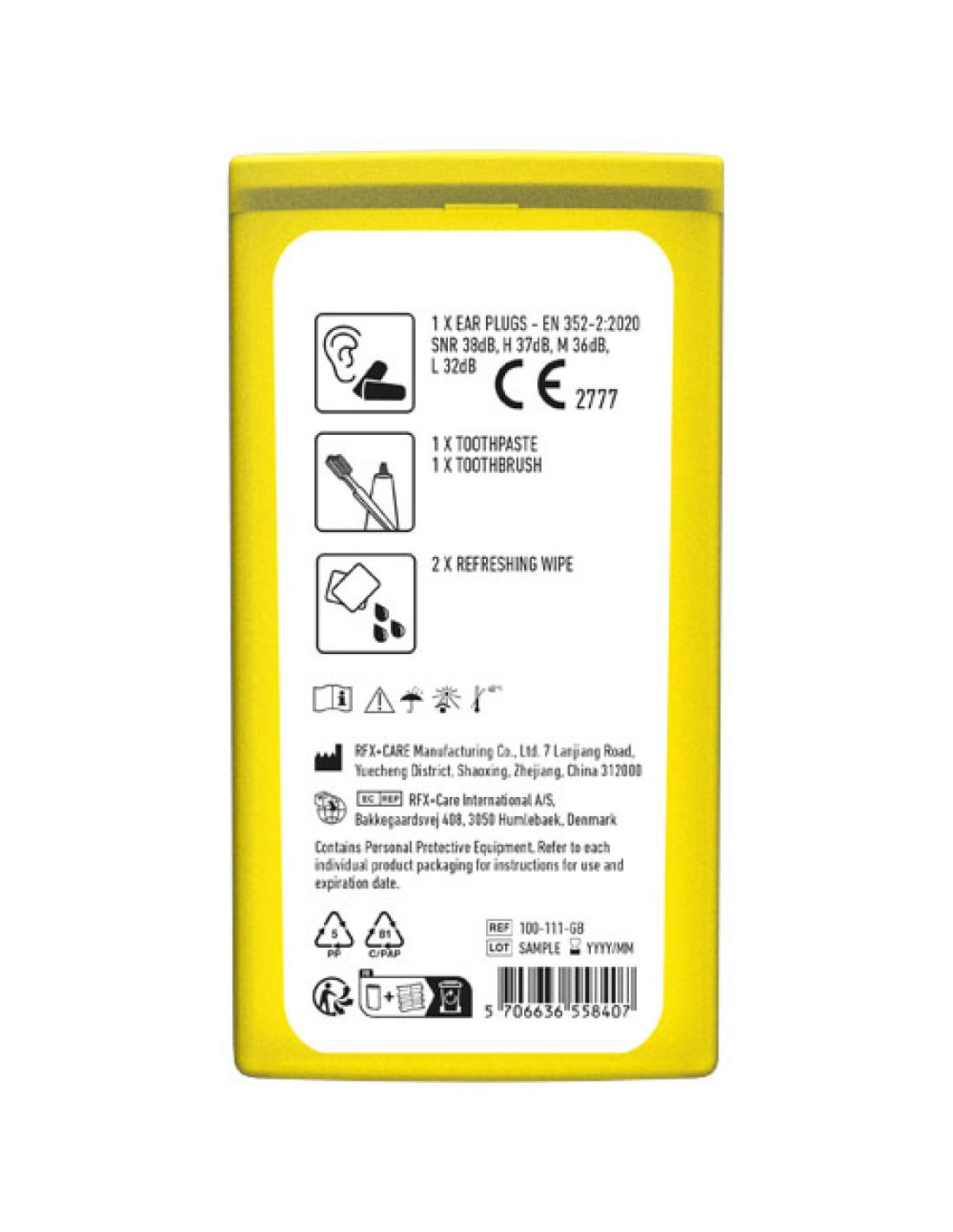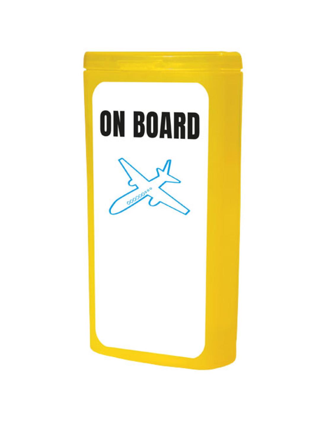Kit ideal para llevar en cualquier viaje y poder relajarte y refrescarte antes de llegar a tu destino. El tamaño es ideal para llevar siempre encima. Contenido: 1 cepillo de dientes, 1 pasta de dientes, 1 tapones oídos, 2 toallitas refrescantes. Todos los complementos de primeros auxilios cumplen todas las normativas de la UE. El precio incluye impresión a todo color en la etiqueta.