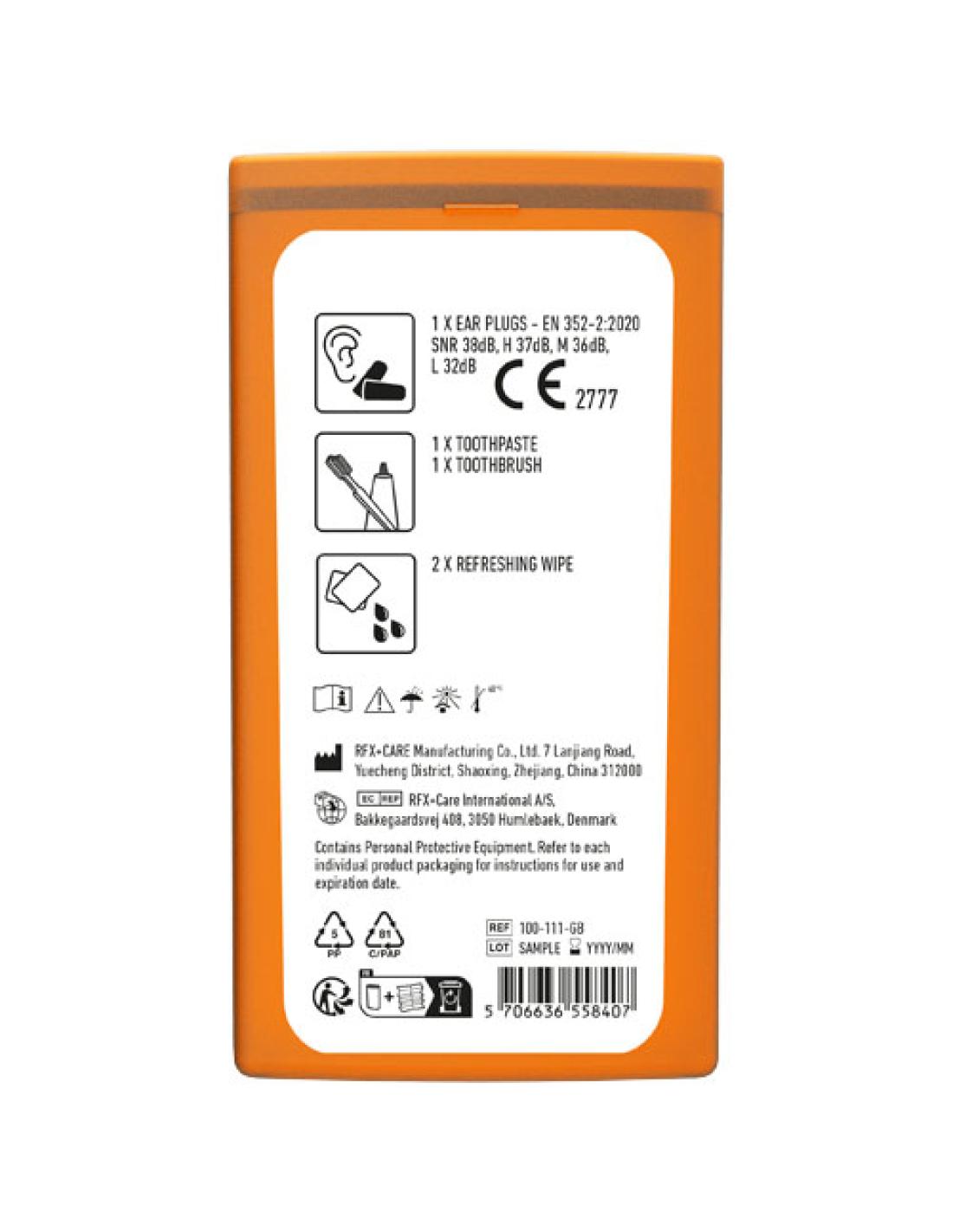 Kit ideal para llevar en cualquier viaje y poder relajarte y refrescarte antes de llegar a tu destino. El tamaño es ideal para llevar siempre encima. Contenido: 1 cepillo de dientes, 1 pasta de dientes, 1 tapones oídos, 2 toallitas refrescantes. Todos los complementos de primeros auxilios cumplen todas las normativas de la UE. El precio incluye impresión a todo color en la etiqueta.
