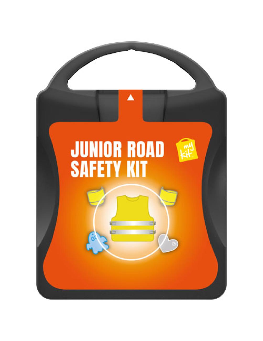 Kit de seguridad vial ideal para niños. Este kit te asegura de que tus niños estarán más visibles y seguros cerca de la carretera. Contenido: 1 chaleco de seguridad, 2 pulseras slap y 2 colgantes reflectantes, 1 pegatina reflectante. Todos los complementos de primeros auxilios cumplen todas las normativas de la UE. El precio incluye impresión a todo color en la etiqueta.