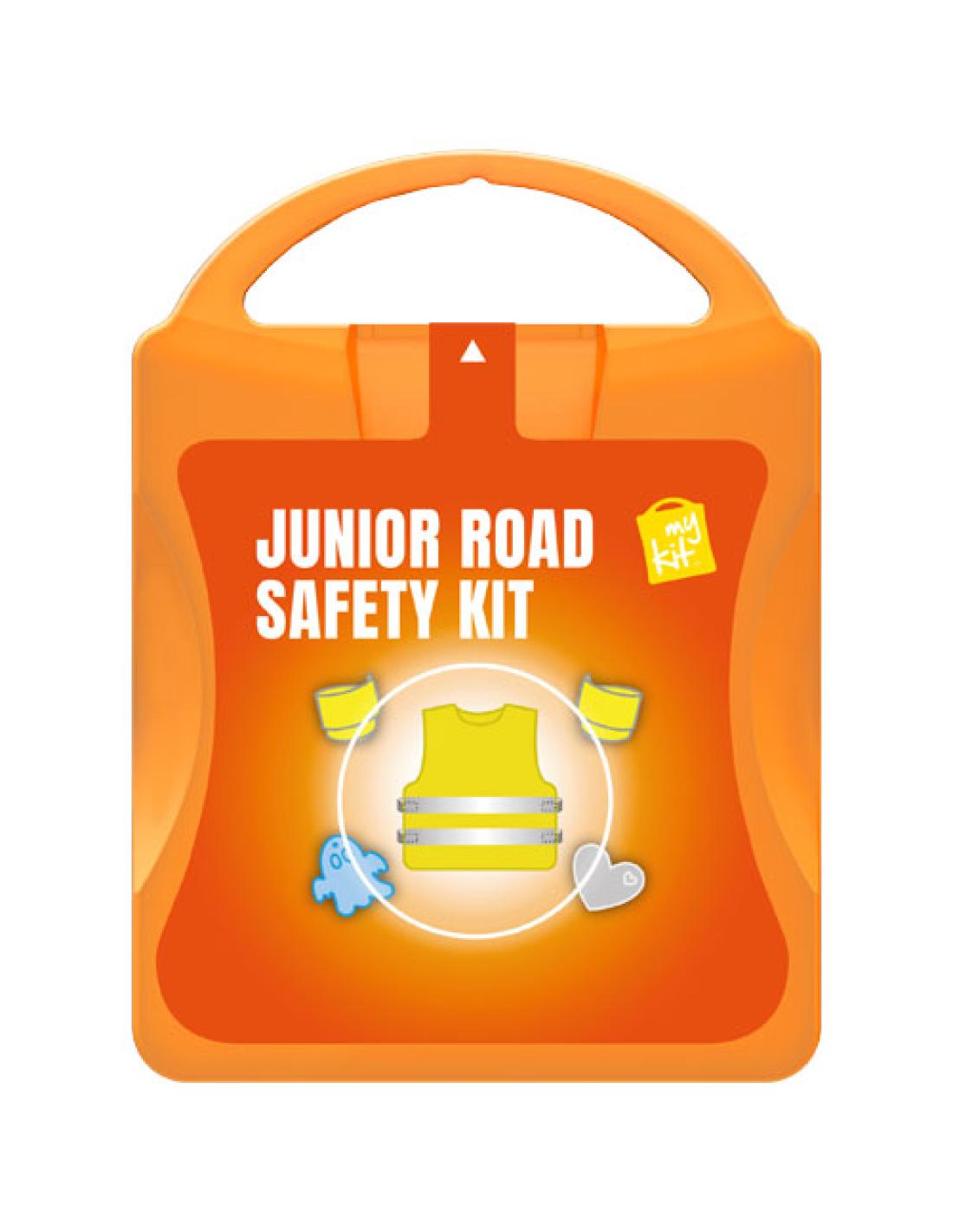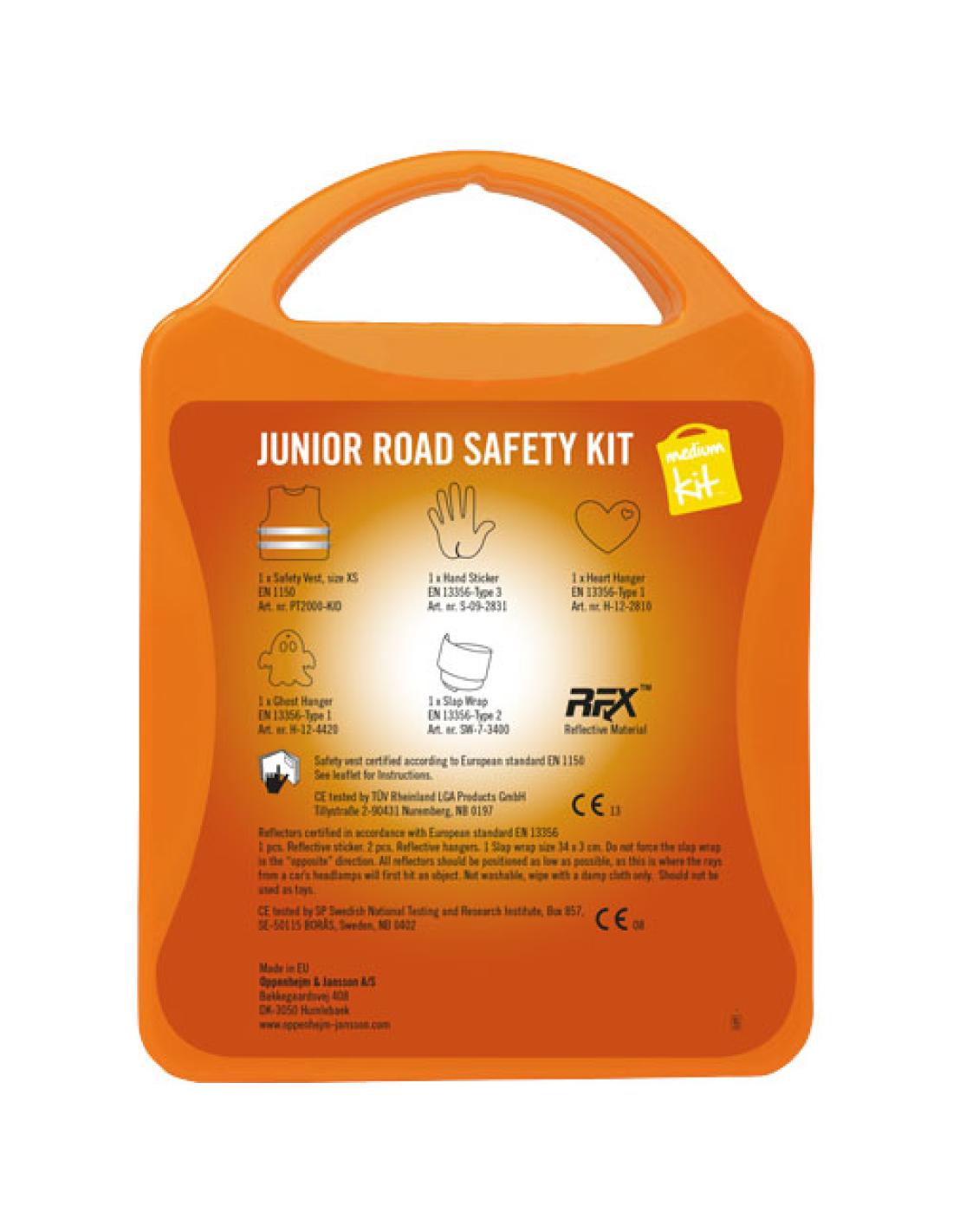 Kit de seguridad vial ideal para niños. Este kit te asegura de que tus niños estarán más visibles y seguros cerca de la carretera. Contenido: 1 chaleco de seguridad, 2 pulseras slap y 2 colgantes reflectantes, 1 pegatina reflectante. Todos los complementos de primeros auxilios cumplen todas las normativas de la UE. El precio incluye impresión a todo color en la etiqueta.