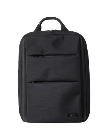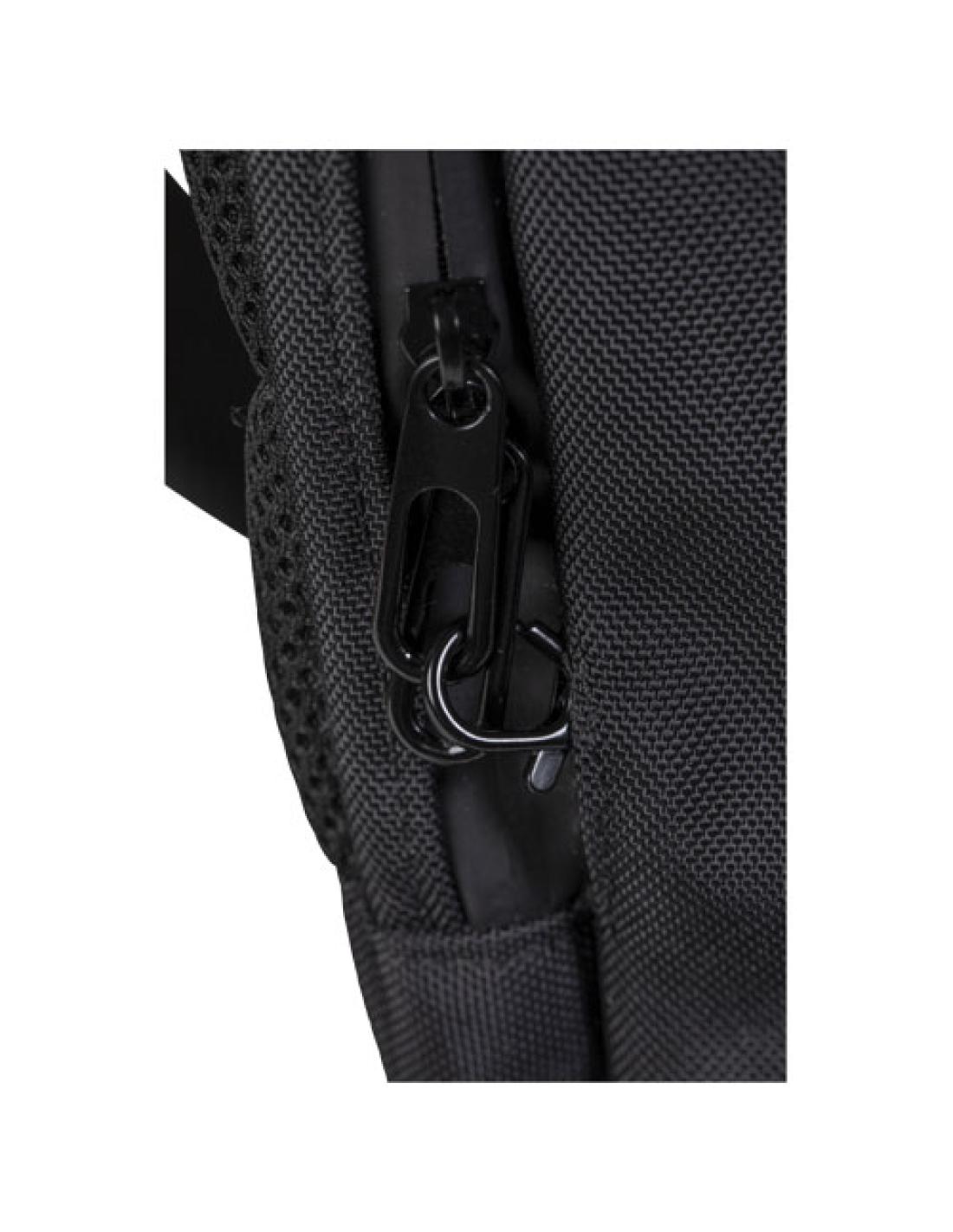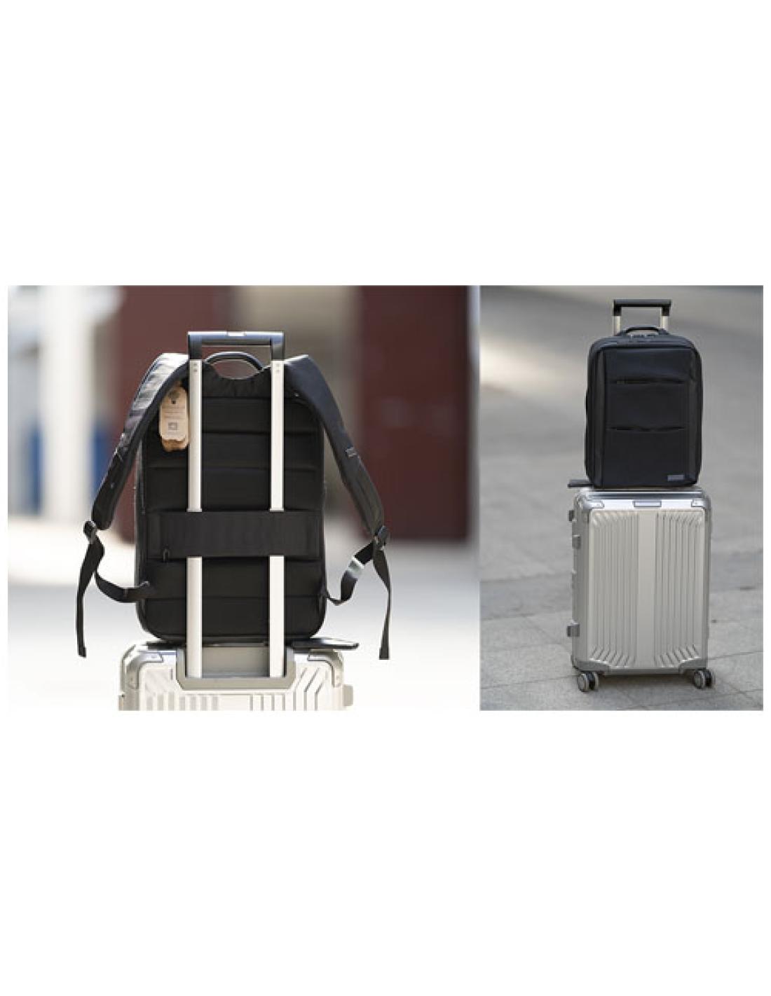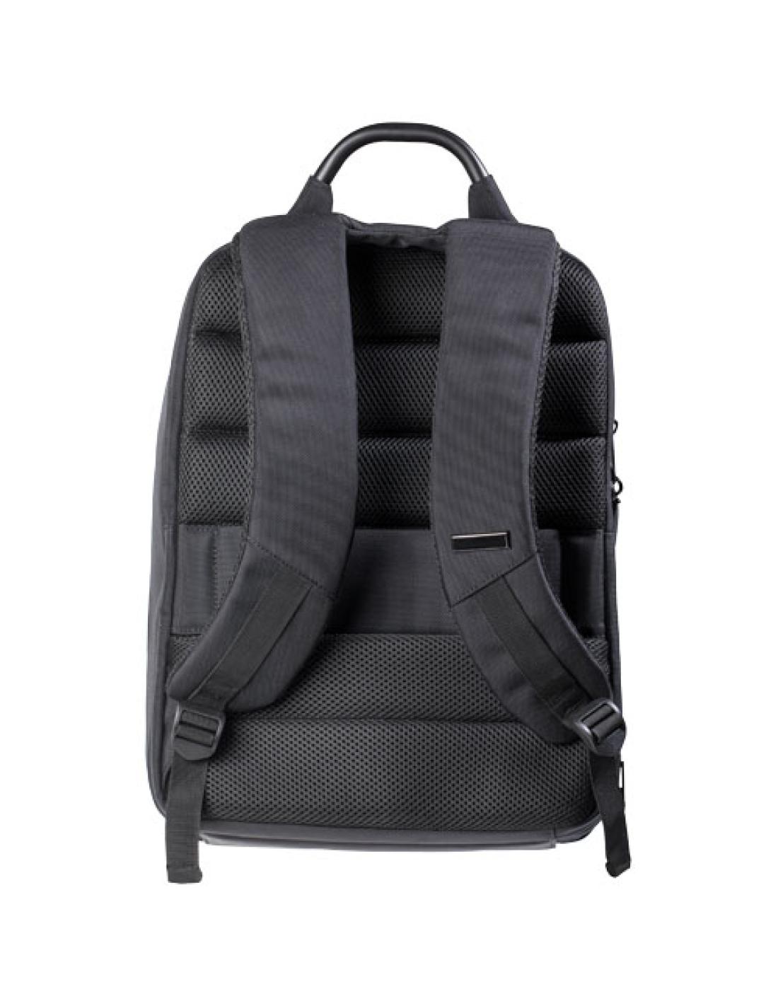 Mochila de negocios fabricada de botellas recicladas y con cable de plástico PET reciclado 3 en 1 (tipo C/micro USB/iPhone) incluido. Equipada con una batería de carga rápida de 10 000 mAh integrada y un cable de carga con logotipo luminoso. La batería está conectada a dos conectores externos (USB y Android). Incluye un bolsillo RFID y un sistema de cierre con cremallera para garantizar un uso seguro. Compartimentos acolchados para el portátil y la tablet. Incluye una correa para llevarlo y un bolsillo trasero oculto. Fabricado en tejido impermeable y RPET. Patente EUROPA EUIPO.