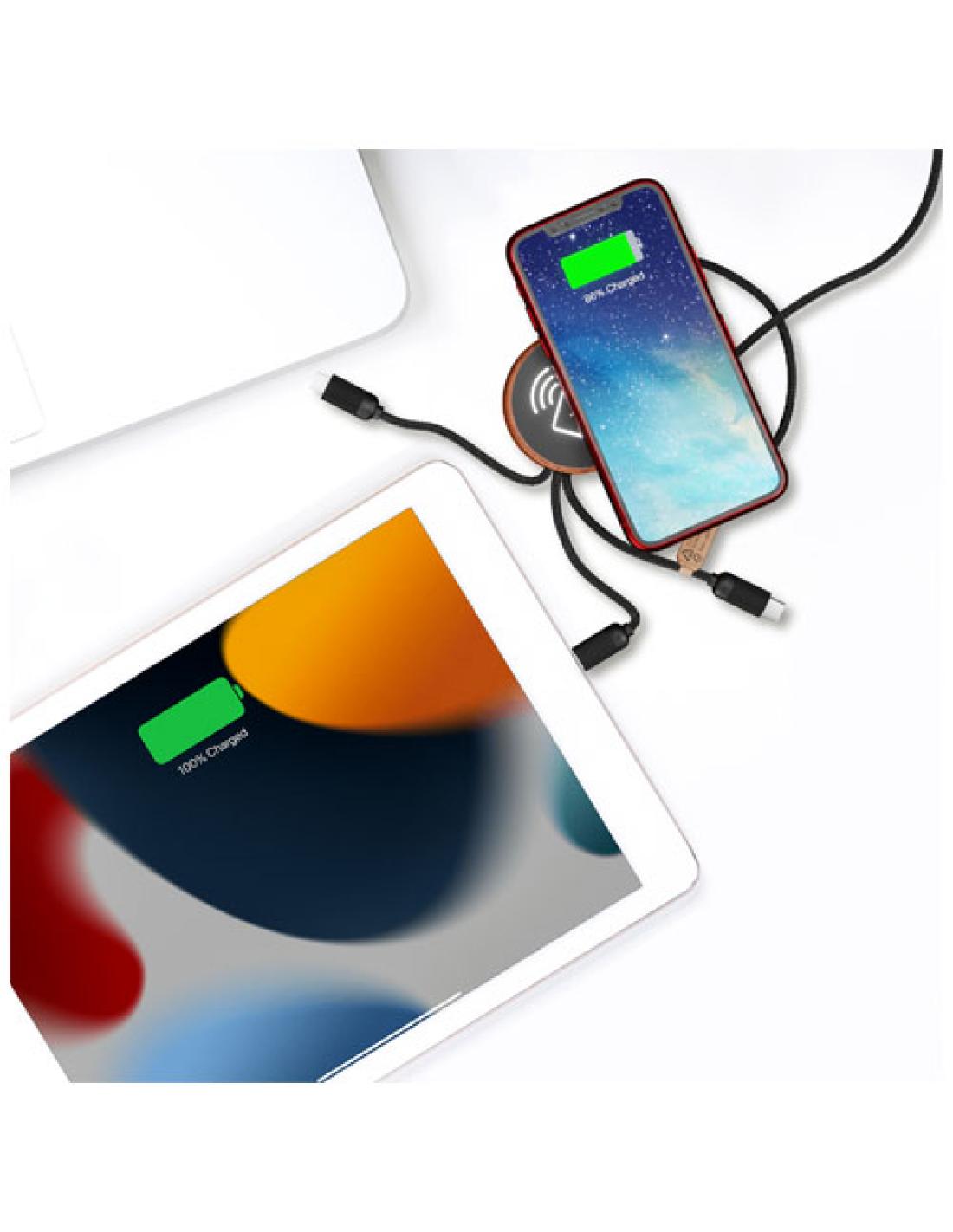 Cable de carga 5 en 1 de PET reciclado con logo retroiluminado y base de carga de bambú de 10 W. Cuenta con 3 conectores (tipo C, micro USB, iPhone) y un conector USB doble para uso universal. Se entrega en una funda de TPU, con una tarjeta de papel kraft. Longitud del cable: 1 metro. Incluye una garantía de tres años. Este artículo también se puede imprimir mediante impresión digital, lo que te permite añadir un logotipo luminoso a todo color en el área designada.