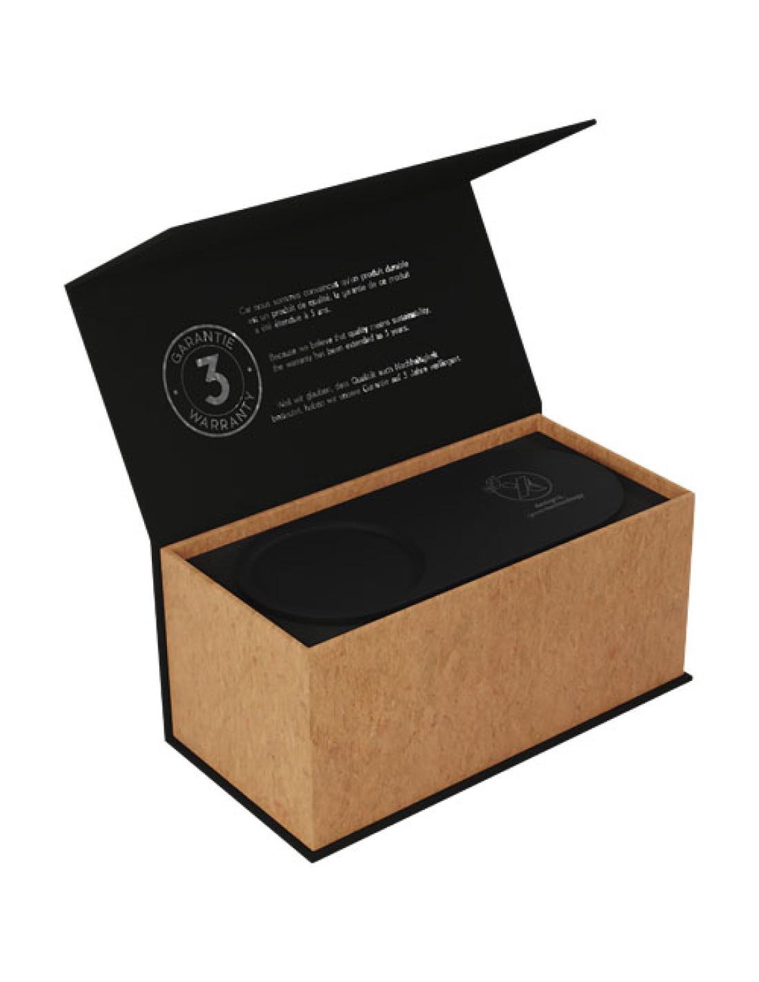 Base de carga inalámbrica de 10 W con soporte de bambú para lápices. La base de carga (18 x 8 x 1 cm) con tratamiento antibacteriano ofrece una carga inalámbrica de 10 W y tiene dos salidas USB: USB 1.0 y USB tipo C 1.0 A. Esto significa que se pueden cargar hasta 3 dispositivos simultáneamente. El logotipo retroiluminado se aplica en la base de carga inalámbrica y se enciende cuando se conecta. Se entrega con un cable de carga fabricado con PET reciclado. El soporte para lápices (7 x 10 cm) está hecho de bambú que procede de fuentes sostenibles, ecológica y socialmente responsables. Se presenta en una caja de regalo (11 x 13,1 x 5,2 cm) con cierre magnético. Incluye una garantía de tres años.