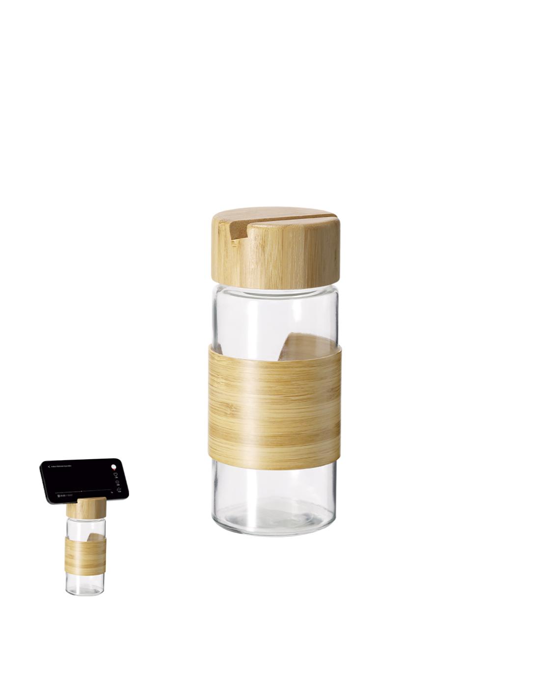 Bidón multifunción de línea nature y 450 ml de capacidad. Cuerpo fabricado en cristal, con tira central en bambú. Incluye tapón a rosca de bambú, con soporte integrado para smartphone. Presentado en caja individual de diseño eco.