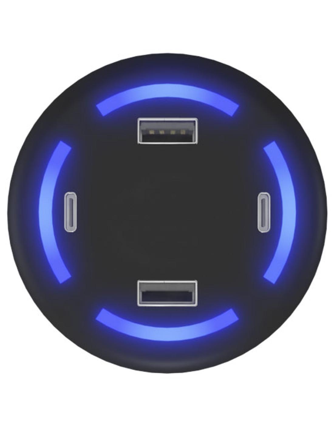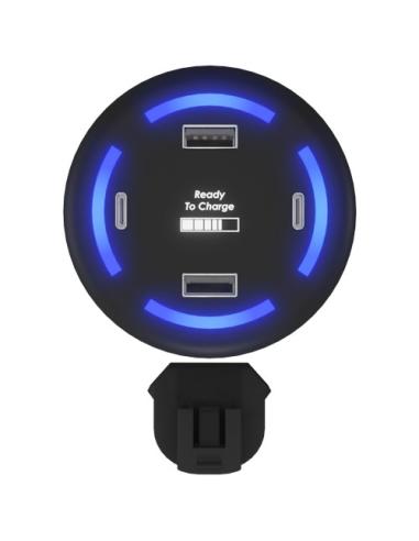 Cargador doméstico inteligente de 4,2 A con acabado de caucho suave al tacto y logotipo retroiluminado. Gracias a los puertos de 5 V/2,4 A, se pueden cargar hasta cuatro dispositivos simultáneamente. El cargador está equipado con salidas 2.4 USB y 2.4 USB-C. Cada puerto tiene un indicador de luz azul que se ilumina cuando se está cargando un dispositivo. Una vez que el dispositivo está completamente cargado, el indicador se apaga para ahorrar energía. Enchufes de salida UE y EE. UU. incluidos. Se entrega en una caja de papel kraft reciclado (9,8 x 12,3 x 5,3 cm). Incluye una garantía de tres años.