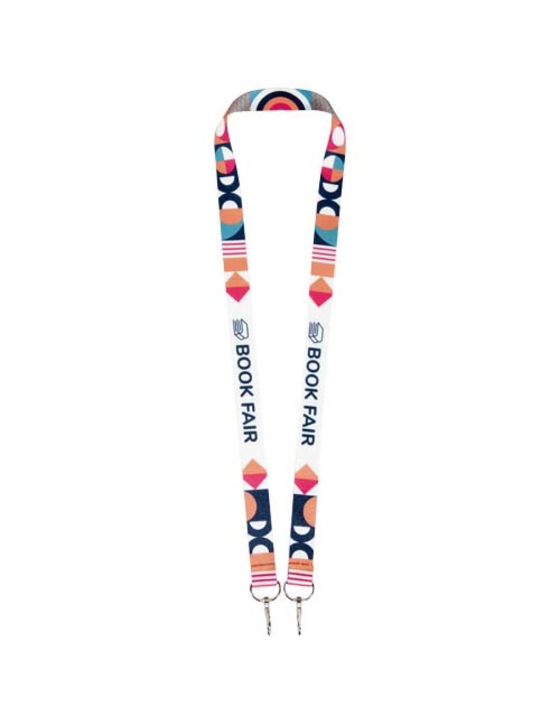 Lanyard en sublimación de RPET a todo color con lanyard de RPET y 2 ganchos metálicos. Puede sostener credenciales, tarjetas de identificación o llaves. Disponible en 4 anchuras diferentes: 10, 15, 20 y 25 mm.