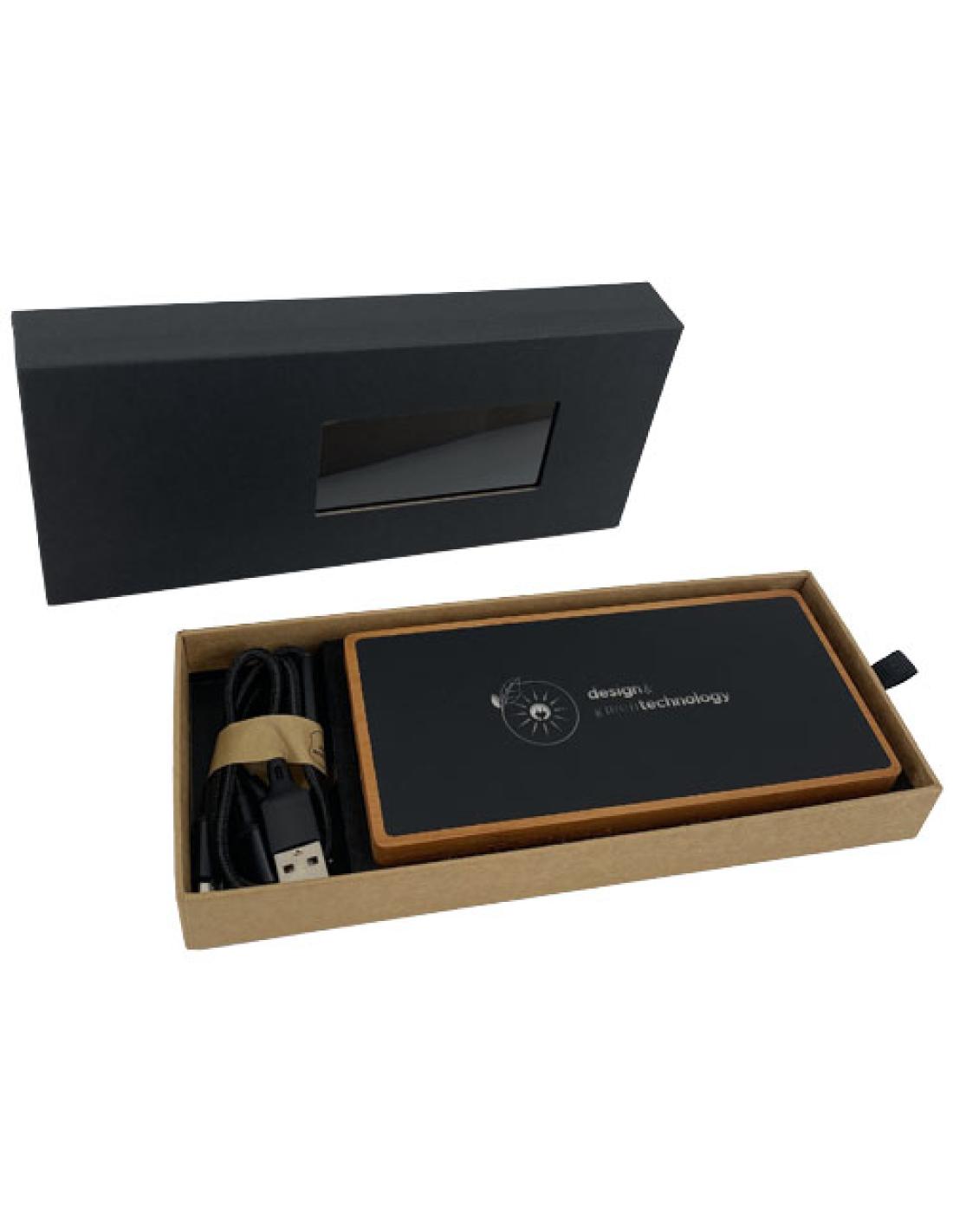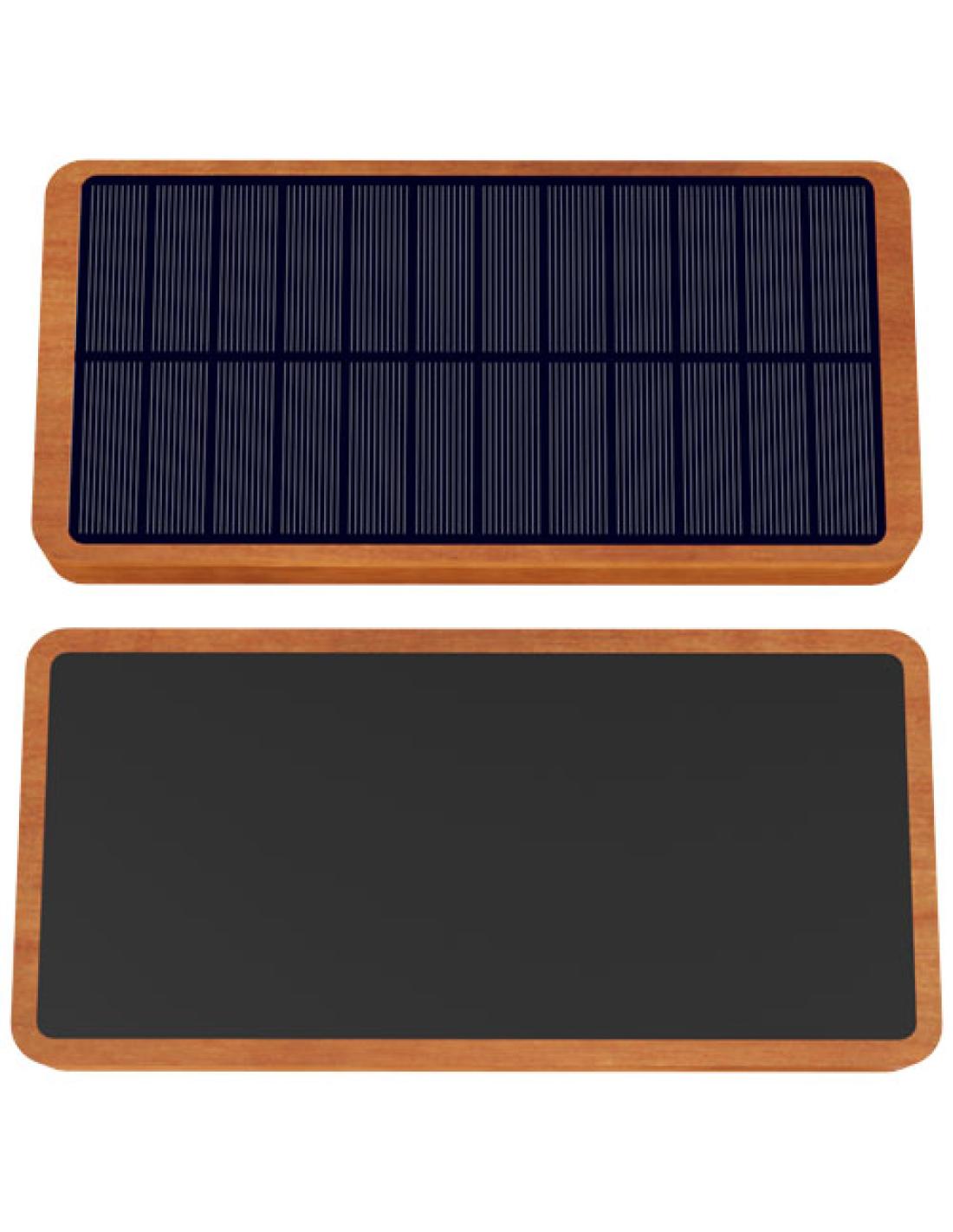 Batería externa solar (14,4 x 6,9 x 1,95 cm) fabricada con madera y plástico reciclado de tacto suave. Tiene una capacidad de 10 000 mAh y se puede personalizar con un logotipo retroiluminado. La batería externa se puede recargar con su panel solar hecho de monocristalino o con el cable de carga de rPET 5 en 1 incluido. Tiene una entrada/salida USB-C y USB-A y una salida inalámbrica de 5 W. Los dispositivos se pueden cargar con el cable incluido o de forma inalámbrica (5 W). El logotipo se ilumina durante 30 segundos cuando se manipula la batería externa, y permanece encendido durante la carga. Se presenta en una caja de regalo de papel reciclado (20 x 8,8 x 2,8 cm). Incluye una garantía de tres años.