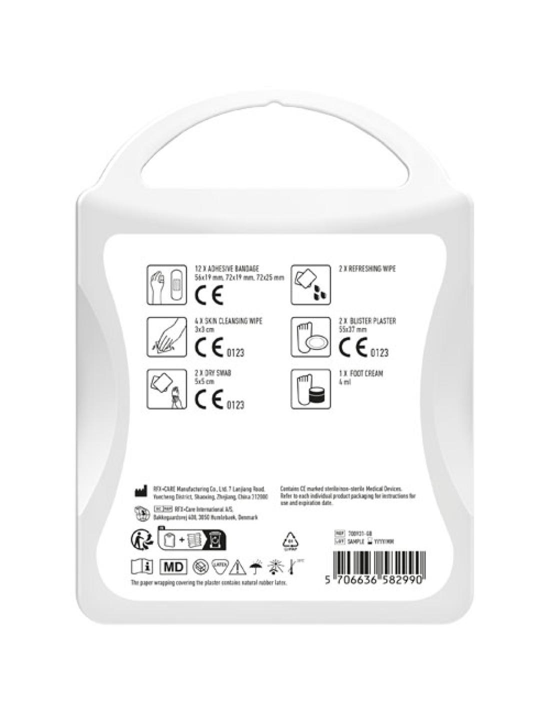 El botiquín para un estilo de vida activo "MyKit" incluye lo necesario para el cuidado básico de heridas y ampollas, así como un gel de recuperación para los pies. Ideal para actividades como caminatas, senderismo, salir a correr, golf, etc. Todos los productos de primeros auxilios y cuidados que contiene el botiquín cumplen la normativa aplicable de la UE. El precio incluye impresión a todo color.