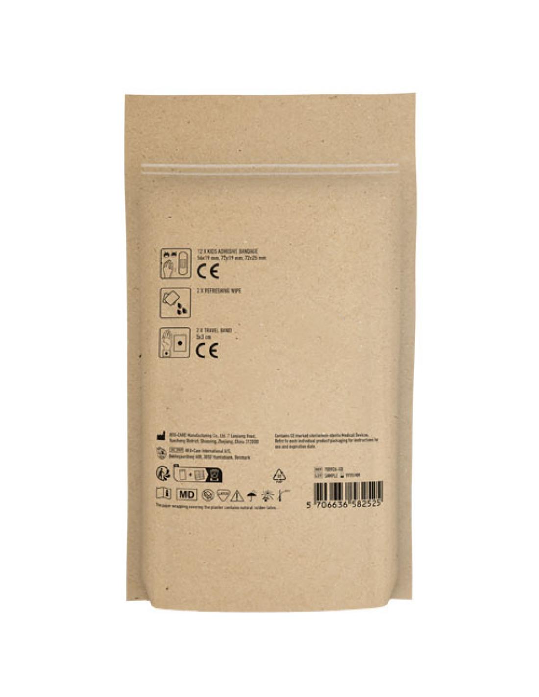 Set de viaje para niños con productos necesarios para curar heridas corrientes y vendas de viaje para reducir los malestares asociados a los viajes. Contenido: 12 apósitos para niños, 2 toallitas refrescantes y 2 vendas de viaje. Todos los productos de primeros auxilios y cuidado del kit cumplen con las normativas vigentes en la UE. El precio incluye impresión a todo color. Se entrega en una funda de papel.