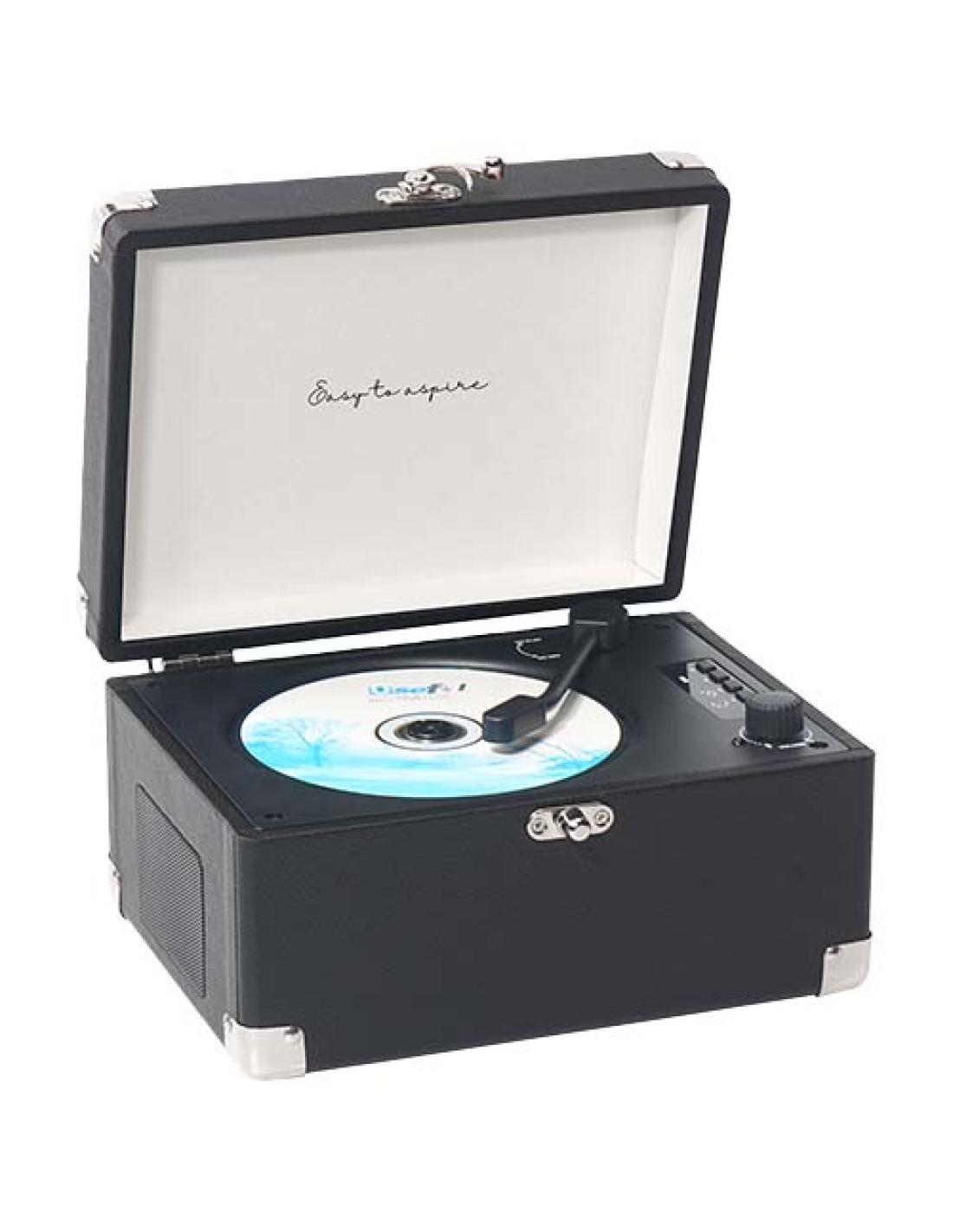 Reproductor de CD y música con conexión USB, AUX e inalámbrica, y también salida para auriculares. Es portátil y tiene 8 horas de autonomía. Gracias a su diseño en forma de tocadiscos, este reproductor de CD aporta un toque vintage al hogar.