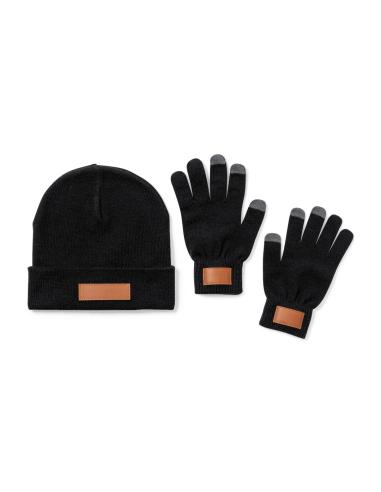 Set de gorro y guantes en talla adulto, fabricados en material acrílico elástico y con parche en polipiel cosido para marcaje. Incluye: Par de guantes con 3 dedos táctiles y elástico de ajuste en muñeca. Gorro a juego con dobladillo.