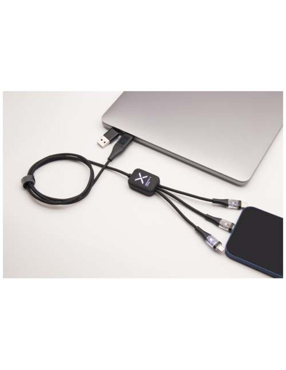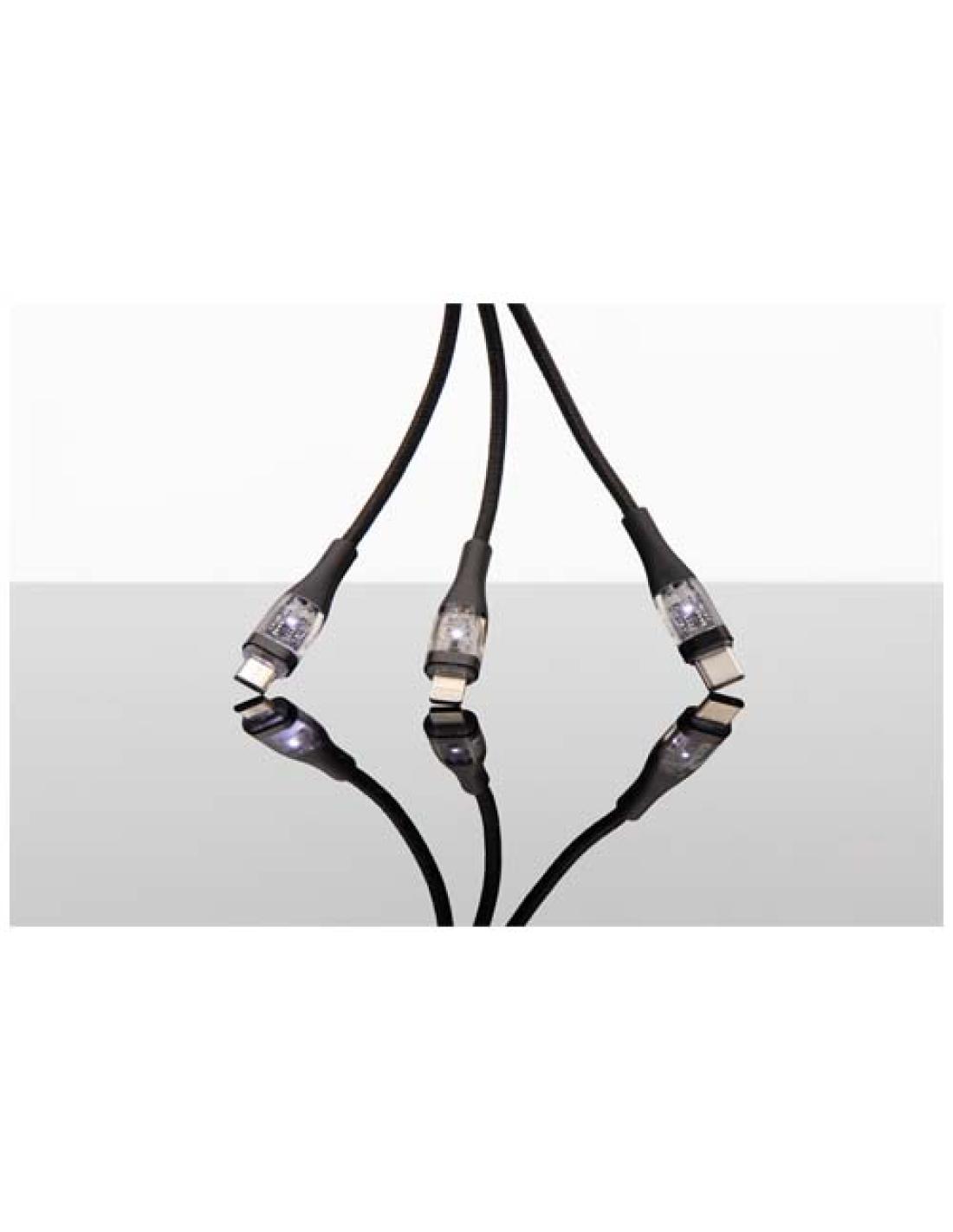 Cable de carga rápida de 60 W 5 en 1 de PET reciclado con logotipo a doble cara iluminado. Dispone de 3 conectores (tipo C, iPhone y Android). Con su doble entrada USB-A y USB-C, es 100 % compatible con los modelos de ordenador más recientes. El cable puede cargar varios dispositivos simultáneamente. Se entrega con una bolsa de TPU reciclable y una inserción de papel reciclado. Longitud del cable: 1 metro.