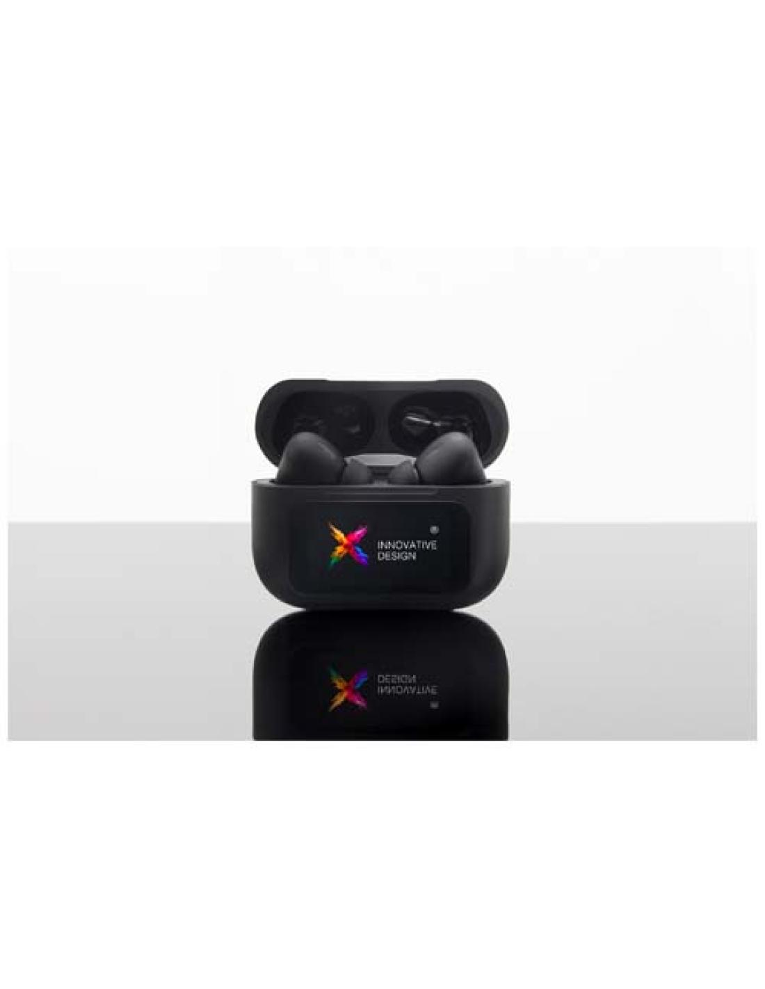 Disfruta de un sonido superior con estos auriculares inalámbricos Bluetooth 5.4/3.0, que incorporan reducción de ruido (ANC) y un estuche de carga con pantalla táctil interactiva, que ofrece funciones como juegos, música y actualizaciones meteorológicas. Tienen una autonomía de 4-5 horas con una sola carga y el estuche de carga puede cargarlos 3 veces. Tiempo de carga de los auriculares: 3,5 horas. Tiempo de carga del estuche de carga: 1,5 horas. Tamaño de pantalla: 1,47". Resolución de pantalla: 320 x 172. Se entrega con un cable USB-C de rPET y en una caja de regalo de cartón reciclado. La carcasa no se imprimirá, sino que el logotipo se mostrará en la pantalla digital.