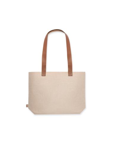 Bolsa de línea nature fabricada en fieltro RPET, con asas largas reforzadas (70 x 3 cm) en polipiel de tono marrón. De acabado cosido y con fuelle en base, con cuerpo disponible en color gris y natural. Etiqueta exterior con distintivo RPET. Resistencia hasta 6 kg de peso.El fieltro RPET es fruto de la combinación del proceso de reciclaje de materiales plásticos junto con la técnica milenaria de fabricación del fieltro, dando como resultado un material de eco-tendencia que, además de ser de origen reciclado, también se convierte en reciclable.