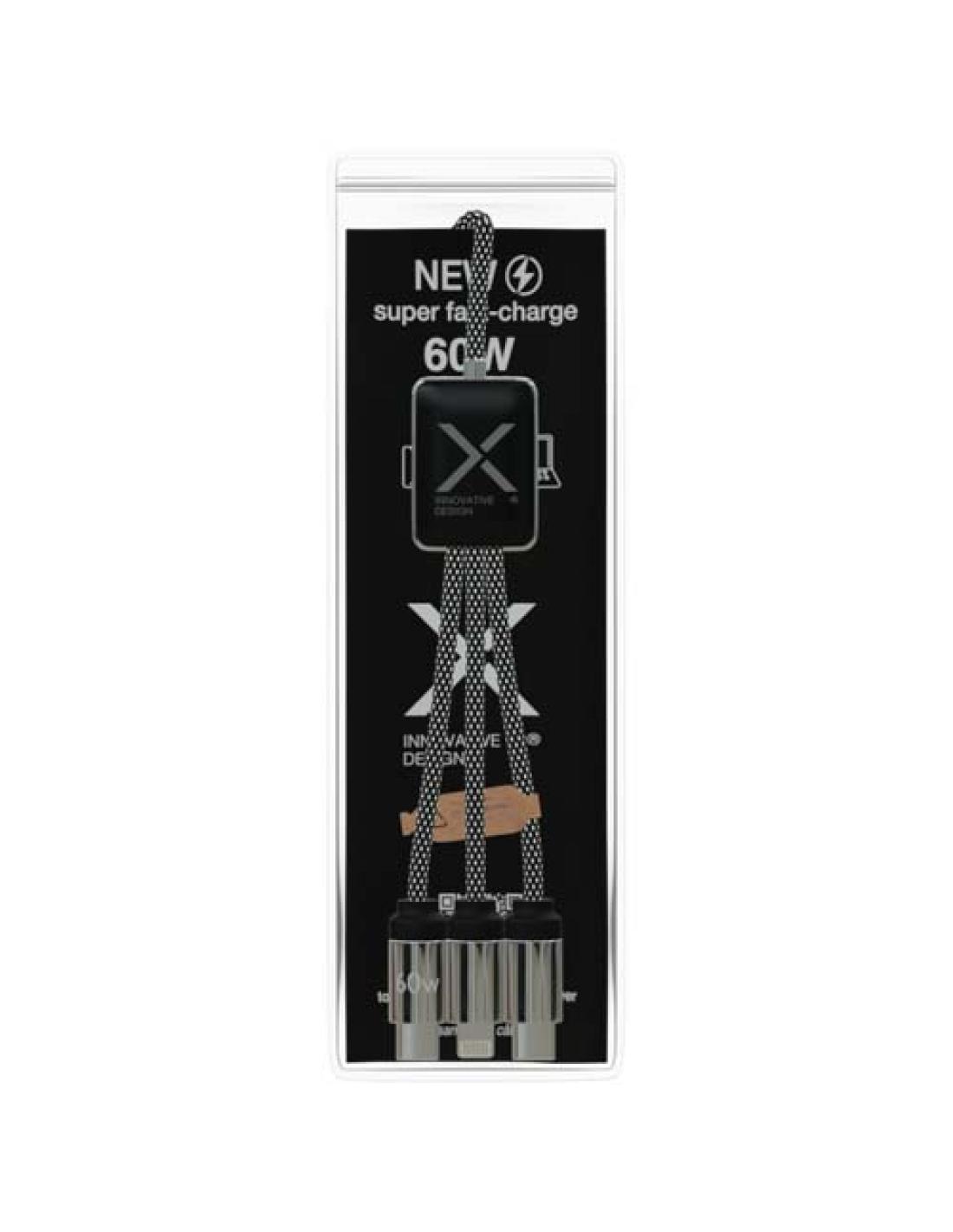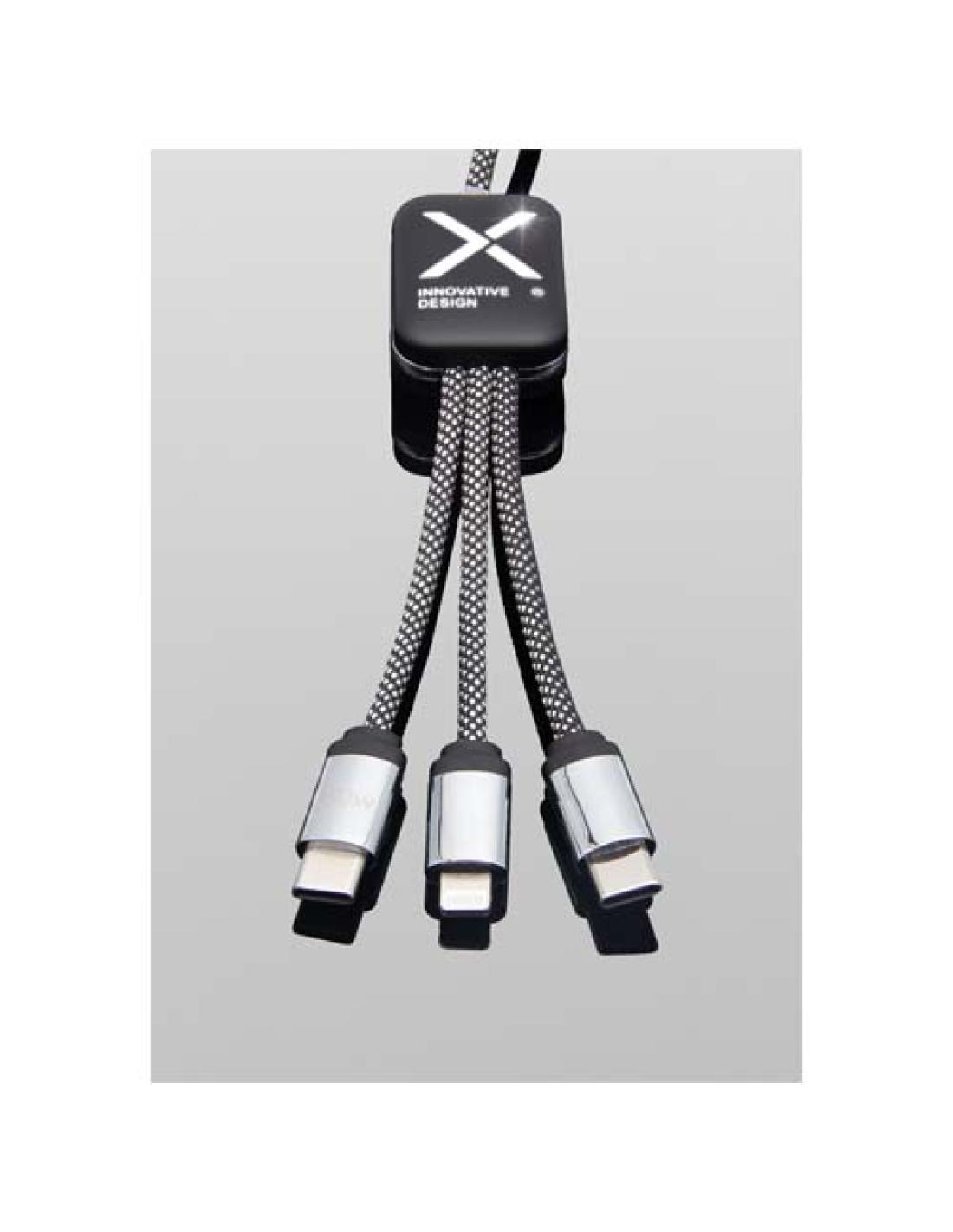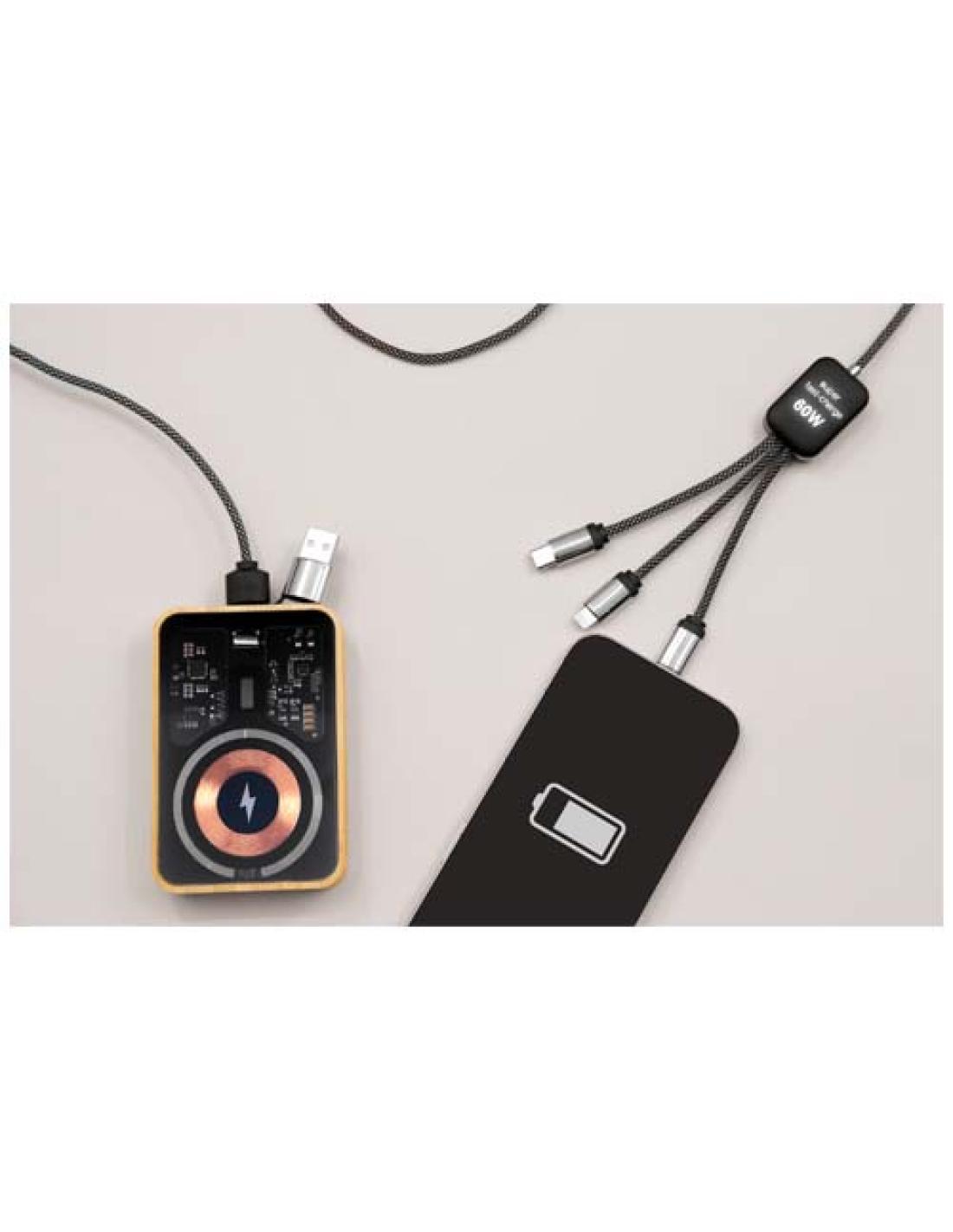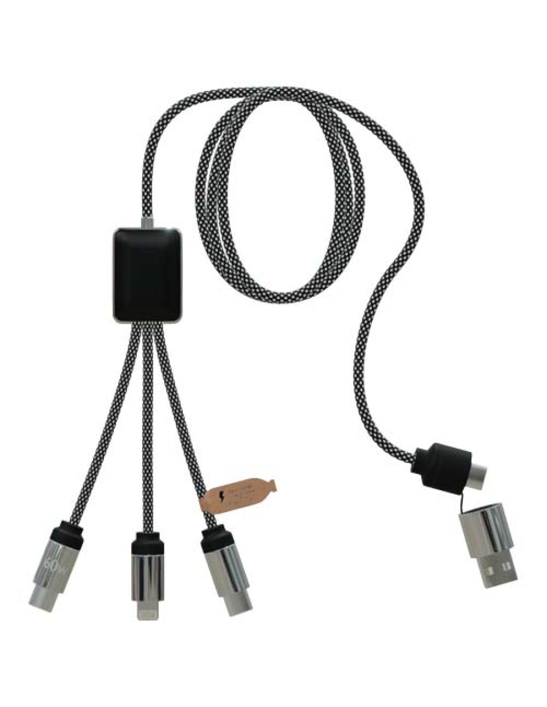 Este cable de carga de 1 metro y 60 W presenta un elegante acabado de caucho y metal, cordones fabricados con botellas de plástico recicladas y dos logotipos retroiluminados, cada uno personalizable y con la opción de ser diferente. Equipado con tres conectores (2 × tipo C y 1 × Lightning), puede cargar dos o tres dispositivos a la vez. Su doble entrada USB-A y USB-C garantiza una compatibilidad total con los ordenadores más recientes, incluidos los modelos con USB-C. El cable incluye personalización a doble cara y se presenta en una funda de TPU reciclable con una tarjeta de soporte de papel reciclado.