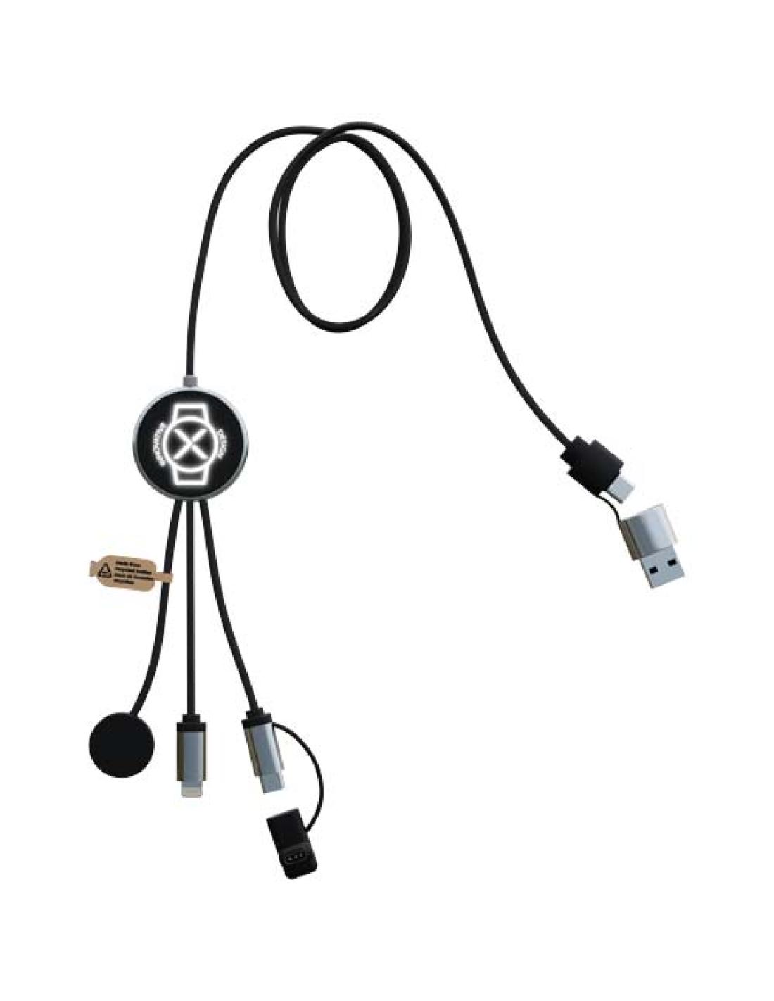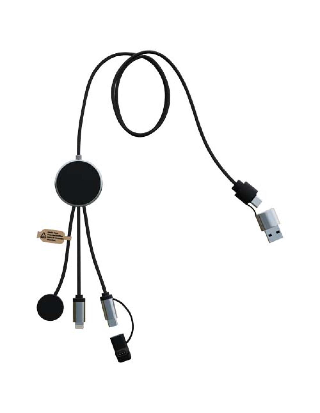 Este cable de carga 7 en 1 está especialmente diseñado para relojes inteligentes y cuenta con cinco conectores de salida: Lightning, tipo C, Apple Watch, Samsung Watch y un conector para Garmin. Incluye opciones de entrada dual (USB-A y USB-C) para una compatibilidad total con los últimos dispositivos y ordenadores con USB-C. Los cordones están hechos de botellas de plástico reciclado, y el cable puede cargar dos o tres dispositivos a la vez. Se suministra con personalización frontal y empaquetado en una funda de TPU reciclable con una tarjeta de soporte de papel reciclado.