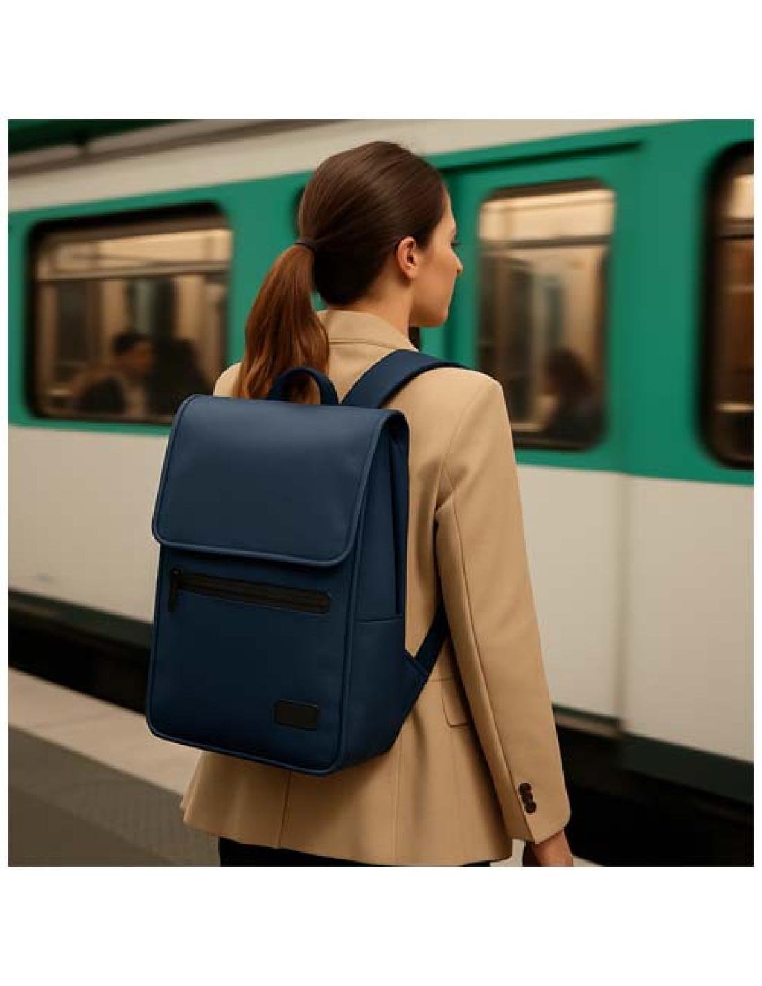 Mochila fabricada con plástico reciclado PU y PET, con compartimentos acolchados para un portátil o tableta, junto con conectores USB/tipo C integrados y un adaptador micro-USB. Al conectar una batería externa (disponible opcionalmente) en el bolsillo diseñado para este fin, la mochila se transforma en una estación de carga móvil. Se cierra con una solapa frontal magnética y cremalleras impermeables, y su diseño estructurado y base acolchada garantizan una protección óptima de tus pertenencias. Incluye la grabación de la placa metálica frontal, una bolsa de almacenamiento no tejida y 3 años de garantía.