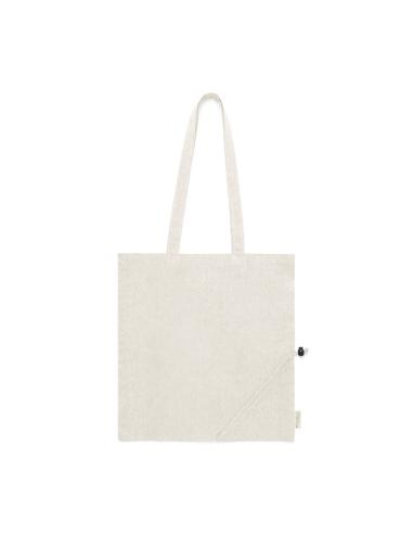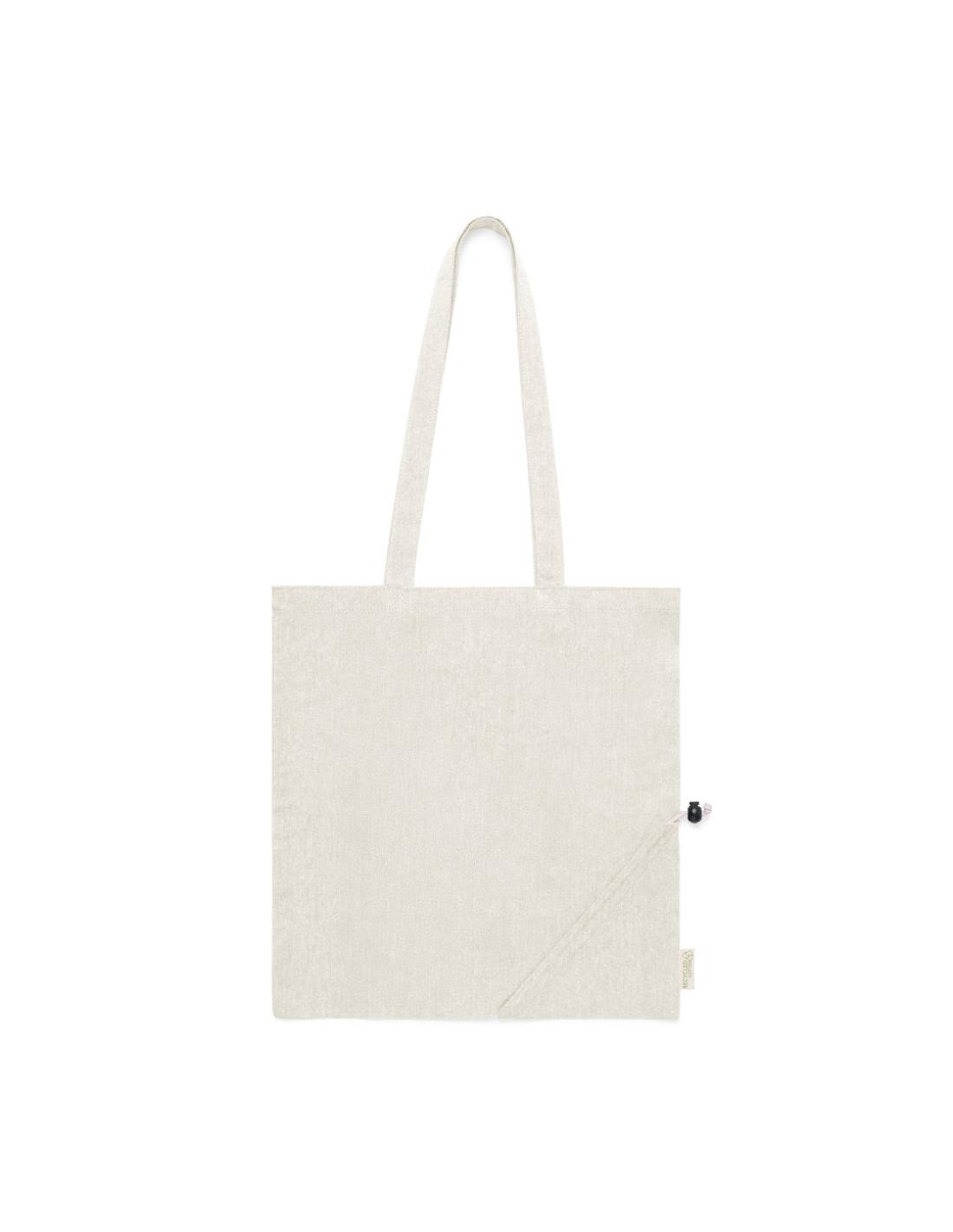 Bolsa plegable de línea nature, fabricada en algodón reciclado de 120g/m2. De acabado cosido y con asas largas reforzadas (70 x 2,5cm). Plegado de pequeño tamaño mediante cordón con accesorio de ajuste. Disponible en variada gama de colores, con distintivo algodón reciclado en etiqueta exterior. Resistencia hasta 6 kg de peso. Certificación GRS (Global Recycled Standard / Estándar de Reciclaje Global), que garantiza el origen reciclado del material usado para fabricar el producto