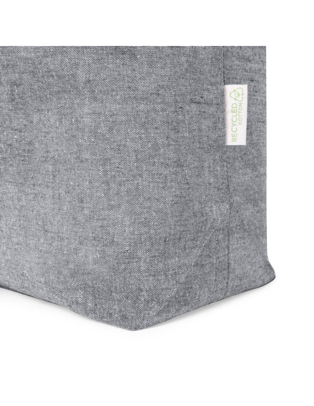 Bolsa de línea nature, fabricada en algodón reciclado de 140g/m2. De acabado cosido y con asas largas reforzadas (70 x 2,5cm). Fuelle en base y disponible en colores natural y negro, con distintivo algodón reciclado en etiqueta exterior. Resistencia hasta 6 kg de peso.Certificación GRS (Global Recycled Standard / Estándar de Reciclaje Global), que garantiza el origen reciclado del material usado para fabricar el producto
