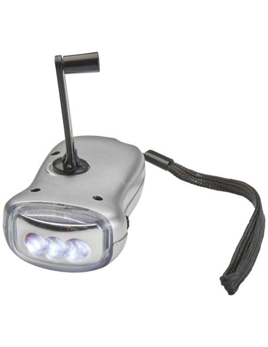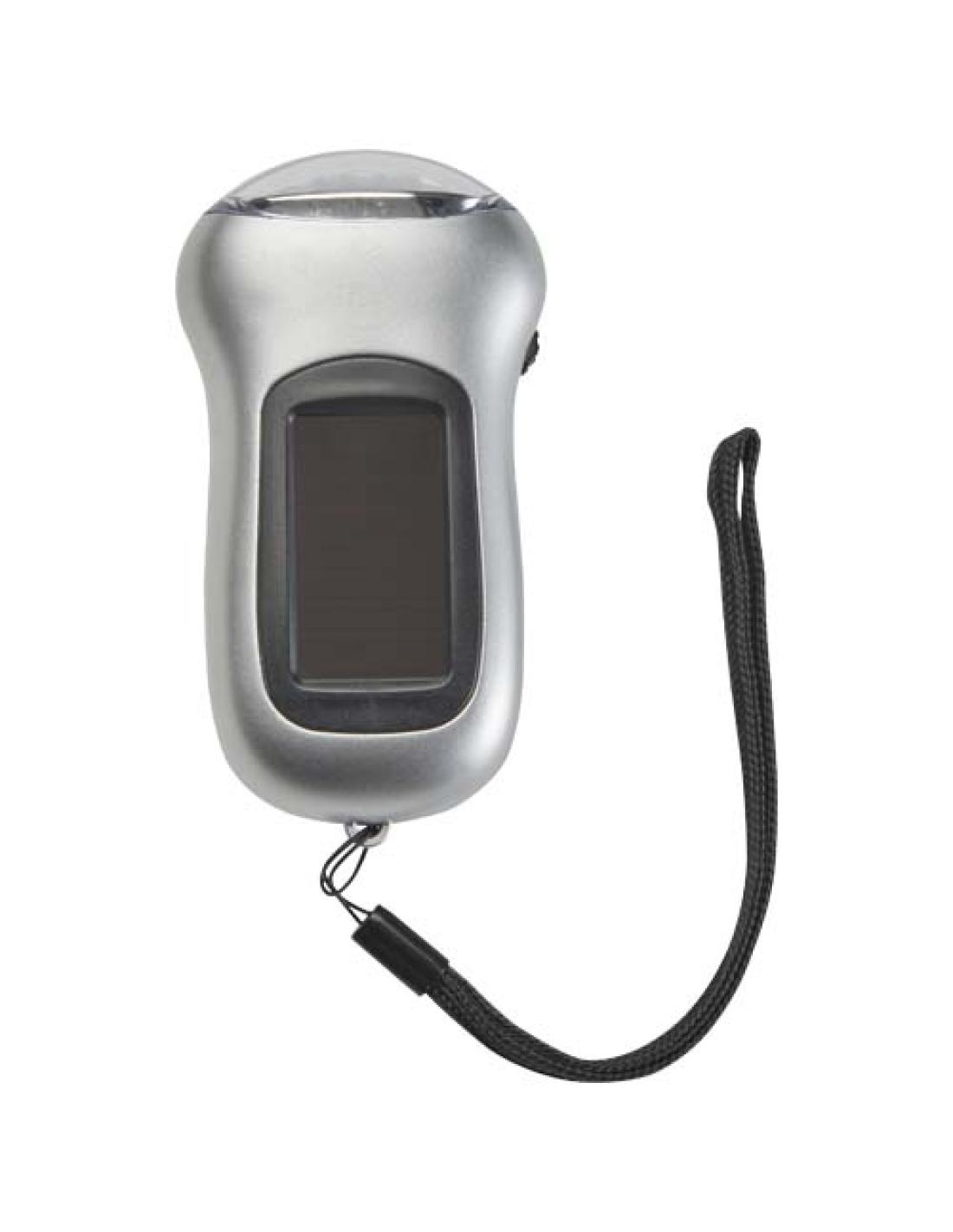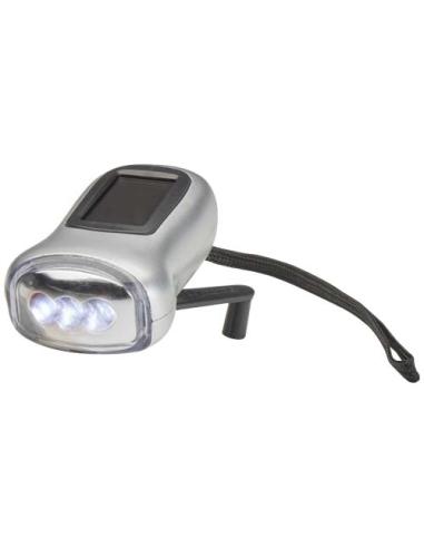 Linterna solar compacta con una luminosidad de 10 000 mcd. La linterna también puede accionarse a mano girando la empuñadura.