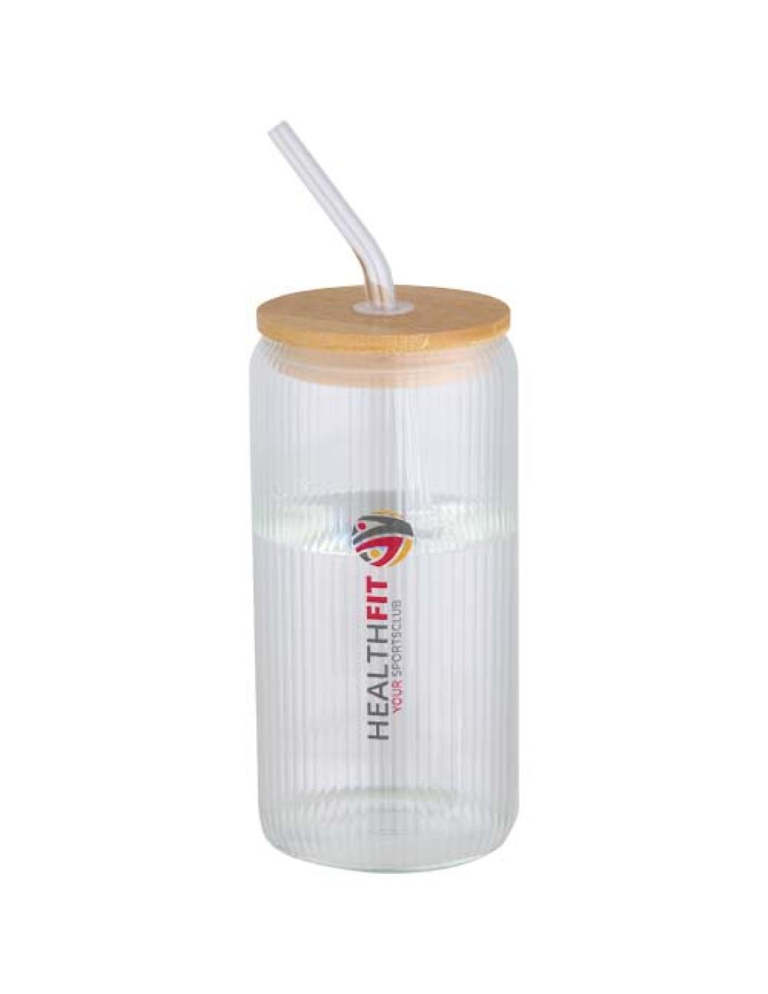 Jarra de vidrio borosilicato con pajita de vidrio y tapa de bambú. La jarra tiene un exclusivo diseño estriado en el interior y un exterior liso, ideal para imprimir un logotipo. El bambú utilizado se obtiene de forma sostenible, respetando la responsabilidad medioambiental y social. Se entrega en una caja de regalo de cartón reciclado. Capacidad: 650 ml.