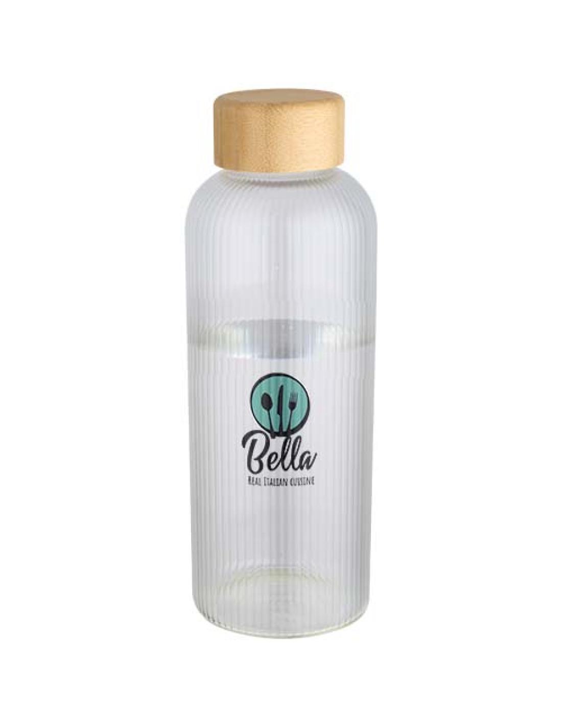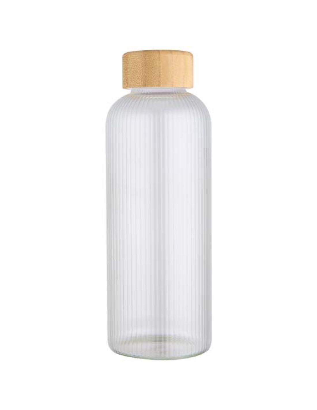Botella de vidrio borosilicato con tapa de bambú. La botella tiene un exclusivo diseño estriado en el interior y un exterior liso, ideal para imprimir un logotipo. El bambú utilizado se obtiene de forma sostenible, respetando la responsabilidad medioambiental y social. Se entrega en una caja de regalo de cartón reciclado. Capacidad: 650 ml.