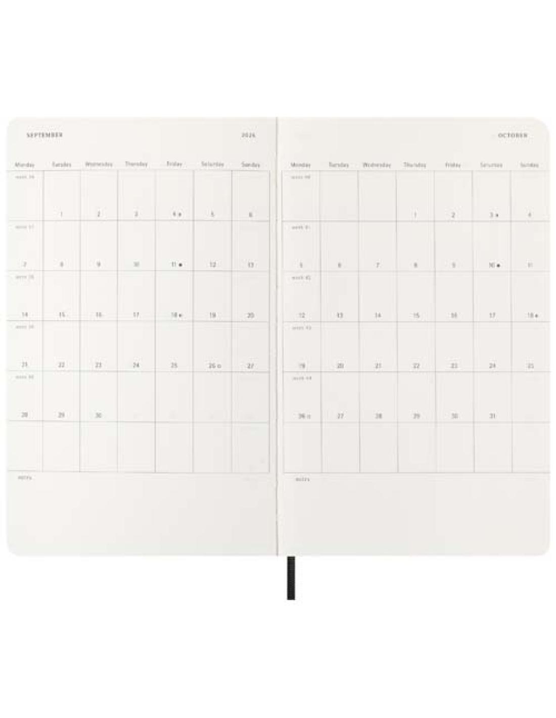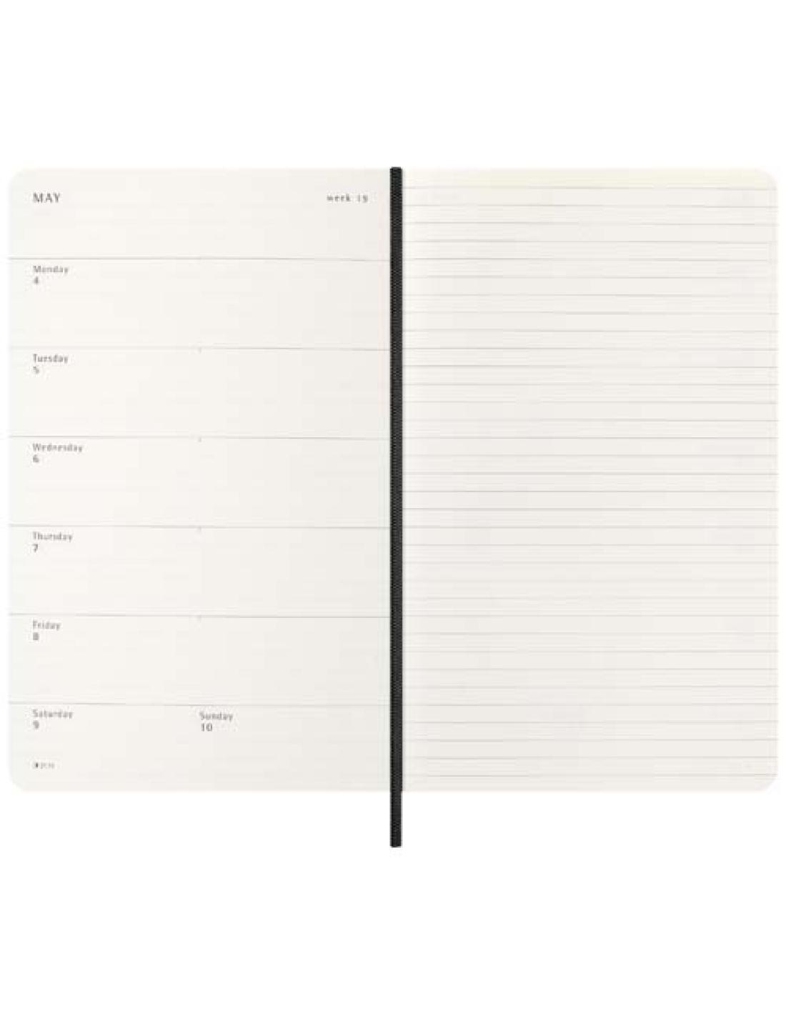 Fechada de enero a diciembre de 2026, la agenda semanal para 12 meses de tapa blanda "Moleskine" muestra la semana completa de un vistazo, al tiempo que ofrece páginas con vista anual y mensual para tener una visión más amplia del año, seguidas de páginas para planificar viajes, ideas y objetivos. Los días de cada semana se muestran en una cara, mientras que la opuesta es una página rayada para tareas y notas. Incluye papel color marfil libre de ácidos, un cierre elástico negro, un marcapáginas de cinta, un bolsillo interior extensible de color a conjunto y adhesivos para la personalización, así como adhesivos del año para el lomo.