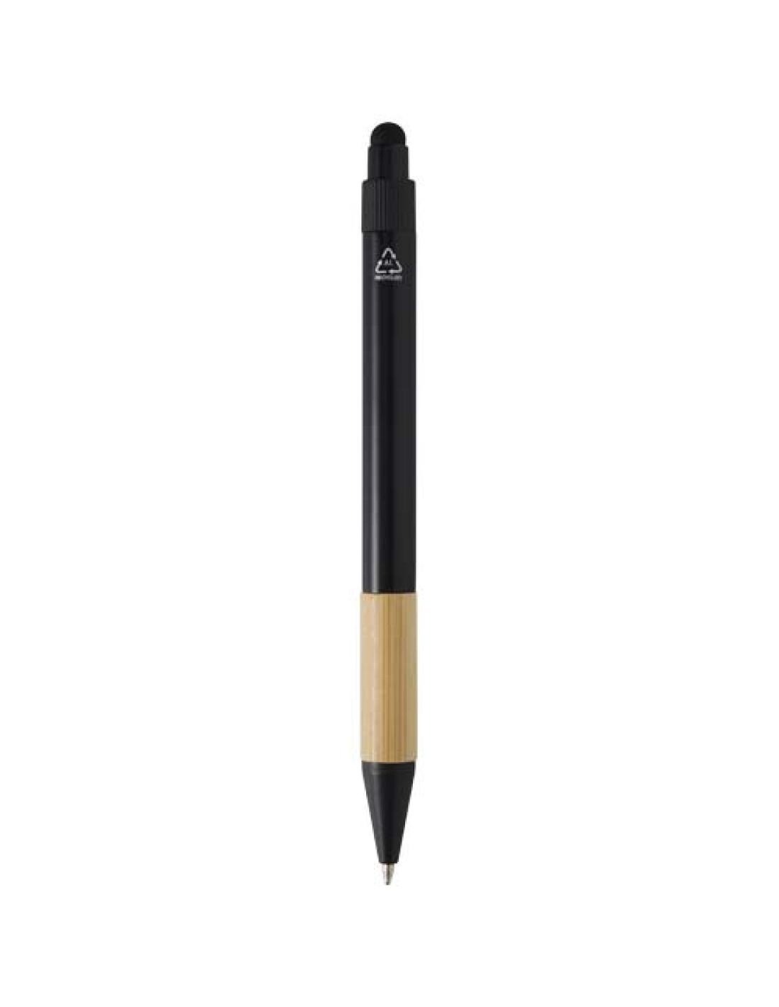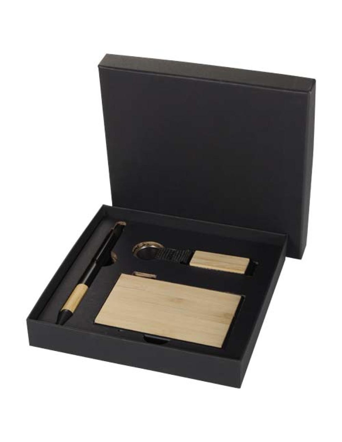 El set de regalo "Minka" incluye un bolígrafo de aluminio reciclado con certificación RCS, una elegante empuñadura de bambú y punta de stylus, un llavero de aluminio (5,5 × 1,8 × 1 cm) con detalles de bambú y un soporte para teléfono integrado, así como un tarjetero RFID (9,7 × 6,2 × 1 cm) con cuerpo de aleación de aluminio y detalles de bambú, que ofrece protección para hasta 10 tarjetas. El bolígrafo contiene tinta negra, con una longitud de escritura de 1000 metros. Un regalo práctico y bien pensado que combina funcionalidad con un diseño moderno. Se entrega en una caja de regalo negra de primera calidad (16 × 16 × 2,7 cm) con una parte frontal lisa, ideal para añadir un logotipo.