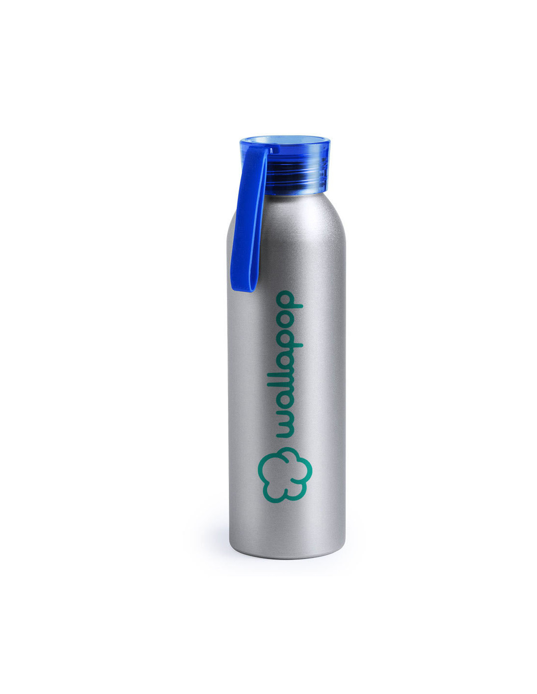 - Bidón de aluminio de 650 ml de capacidad. Cuerpo en color plateado, con tapón de seguridad a rosca en variada gama de colores transparentes. Cinta de transporte en material TPR a juego.