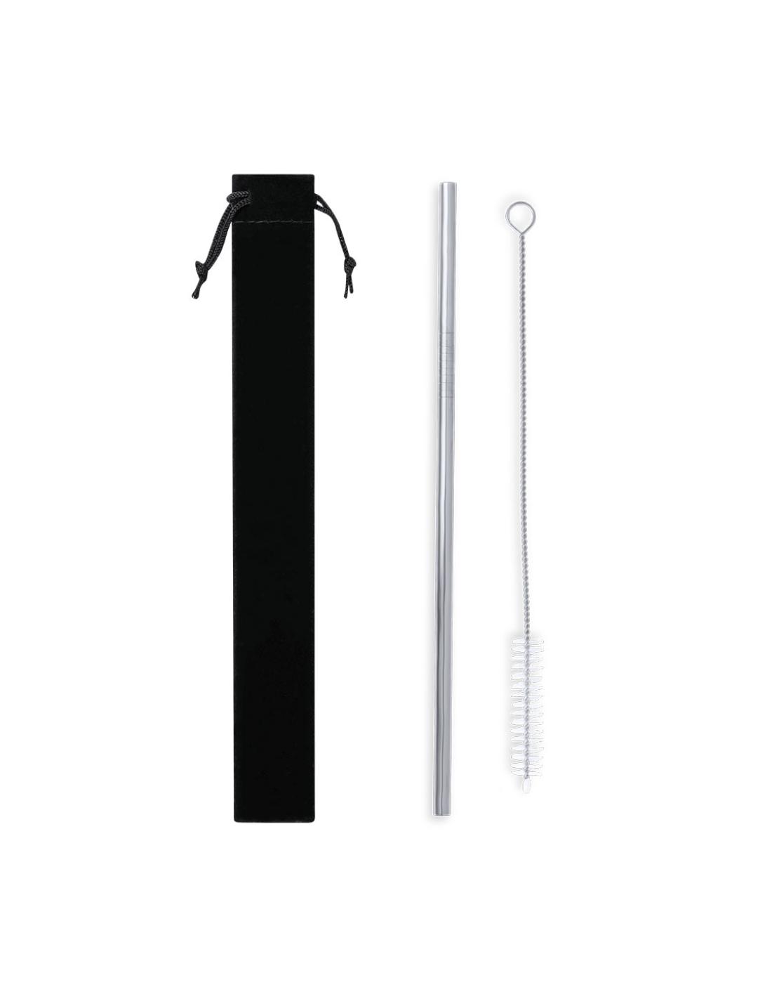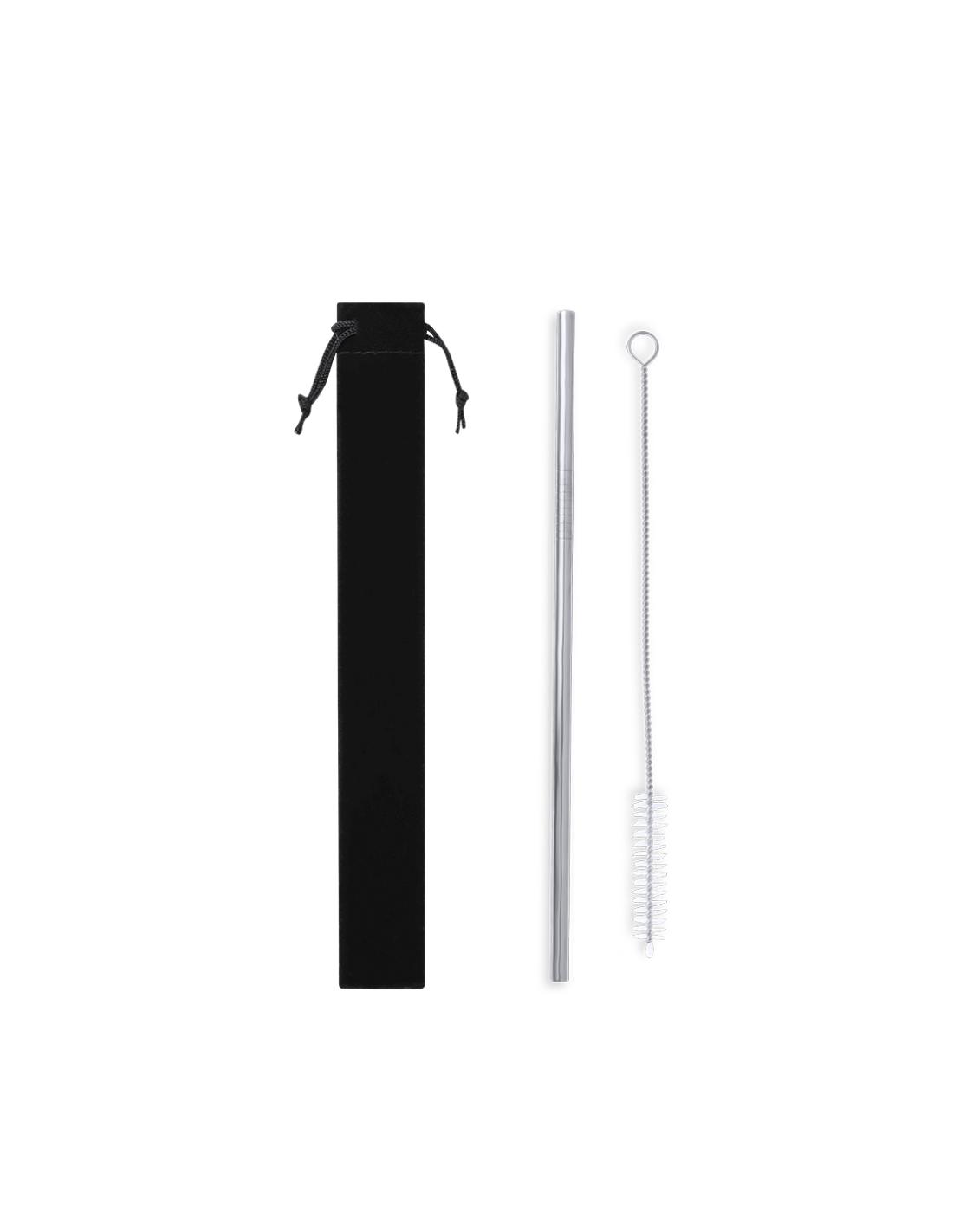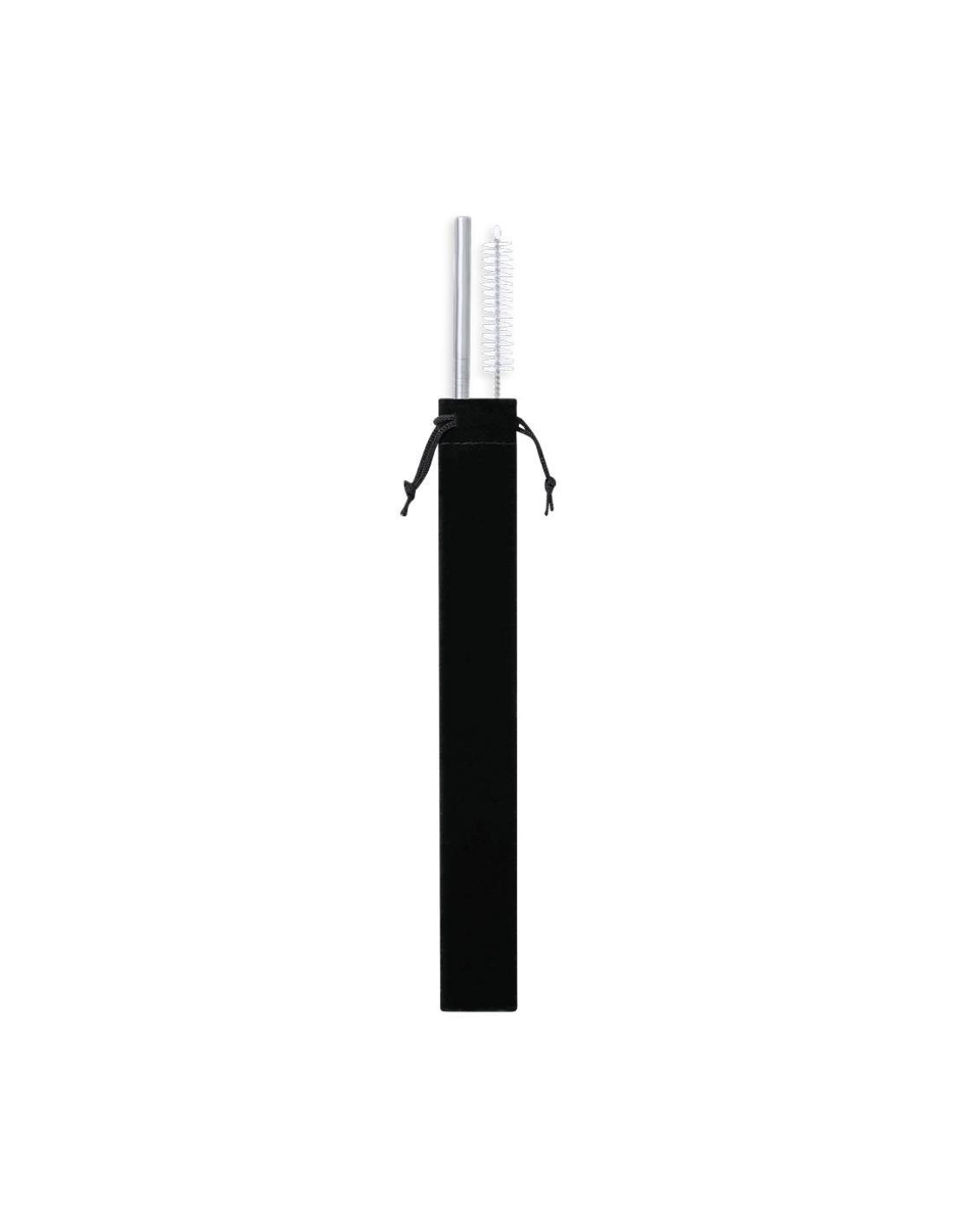 Juego de pajita reutilizable en acero inox. Con accesorio cepillo limpiador incluido y presentada en estuche de suave microfibra con cordones ajustables para mejor cierre.