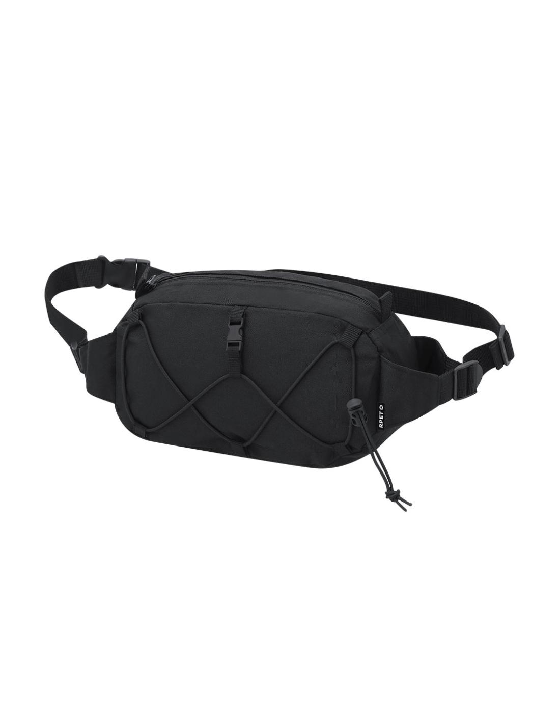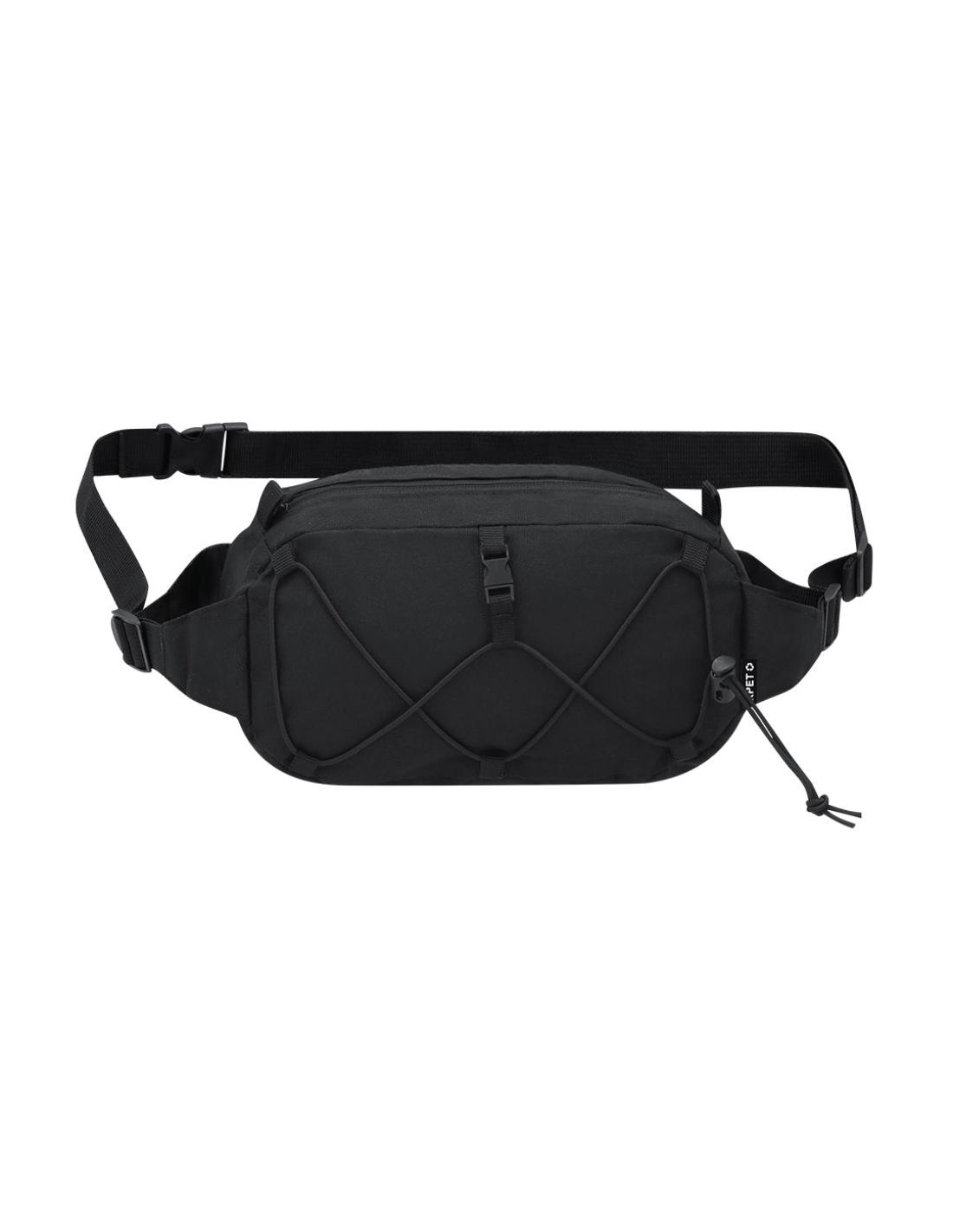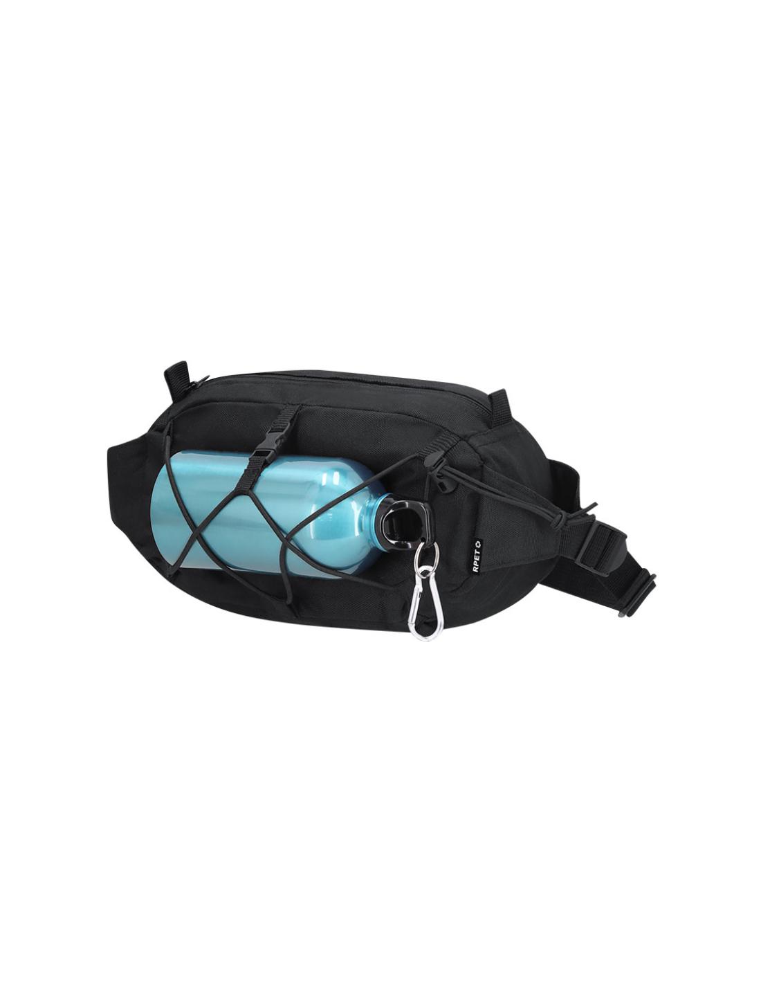 Riñonera fabricada en poliéster RPET 600D. Cuenta con un bolsillo principal con cierre de cremallera invisible en color negro, con tirador metálico en negro, y cinta ajustable con cierre de hebilla en la correa. En la parte frontal incluye un cordón elástico ajustable. Incluye etiqueta distintiva de RPET.
