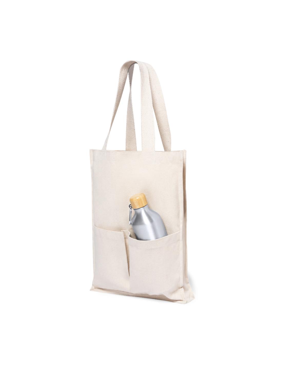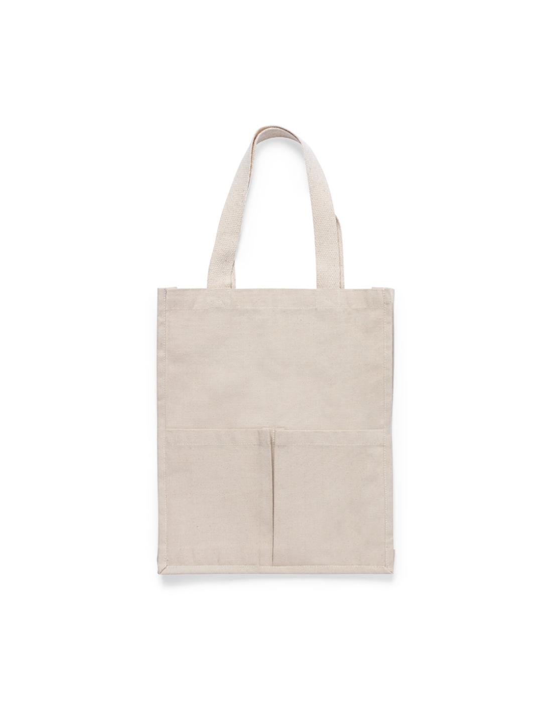 Bolsa fabricada en algodón 100%, de acabado natural y en gramaje extra de 310g/m2. Con dos bolsillos exteriores, de acabado cosido y con fuelle. Asas medianas extra anchas y reforzadas (58 x 3,5 cm). Resistencia hasta 10 kg de peso.