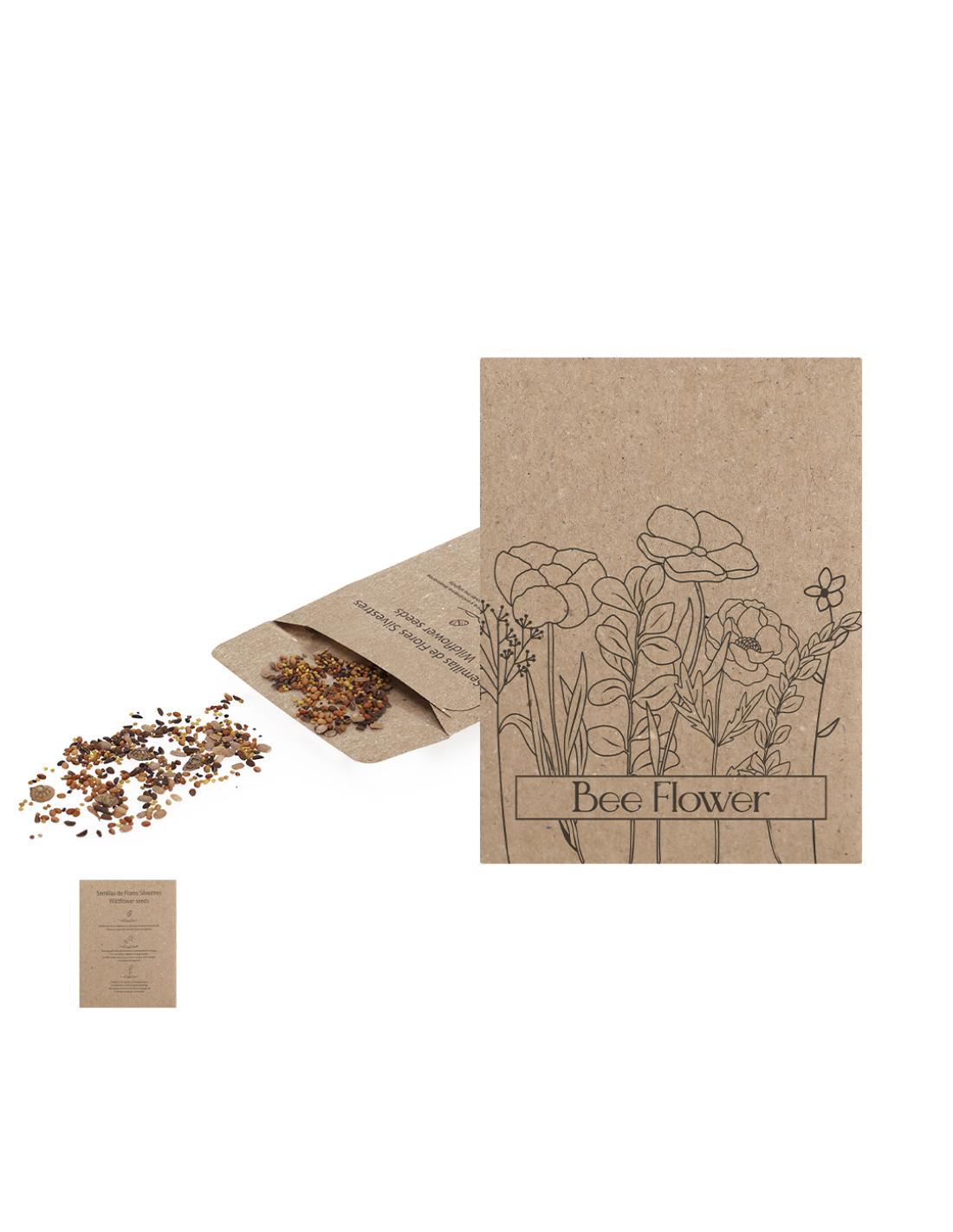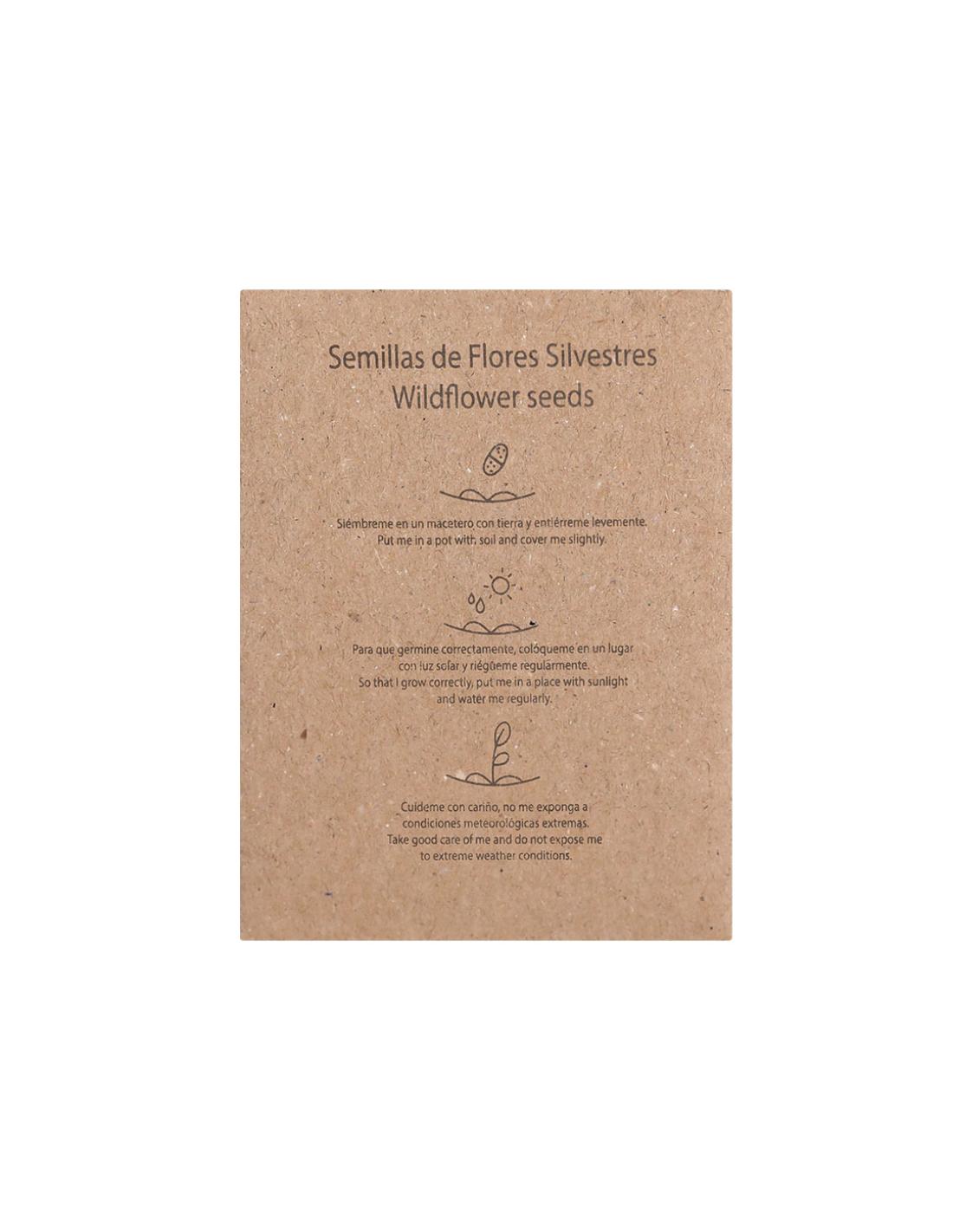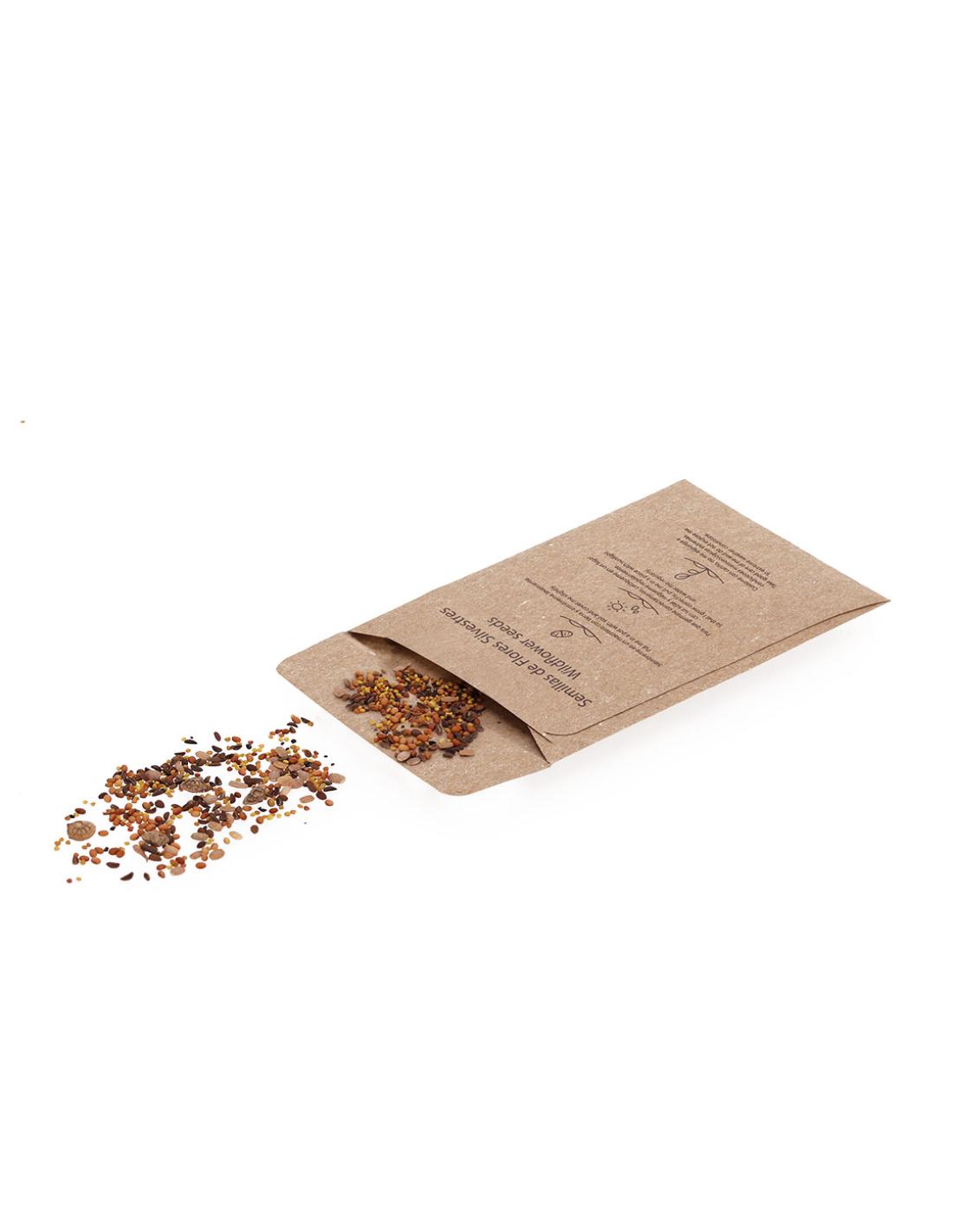 Sobre de papel kraft que contiene una mezcla de semillas de flores silvestres, ideal como obsequio ecológico, permitiendo la siembra directa.