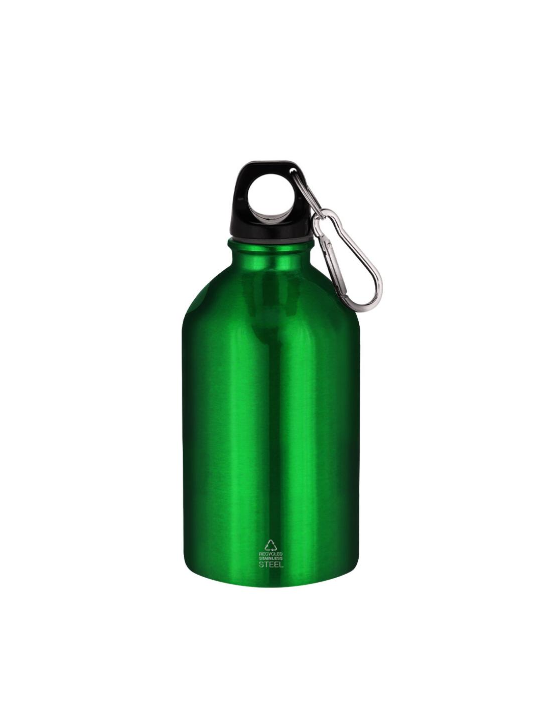 Bidón con 500 ml de capacidad. Fabricado en Acero Inoxidable Reciclado con acabado metalizado. Tapón negro de cierre a rosca para garantizar un sellado óptimo. Incluye mosquetón metálico que facilita su transporte. Con distintivo Acero Inoxidable Reciclado.