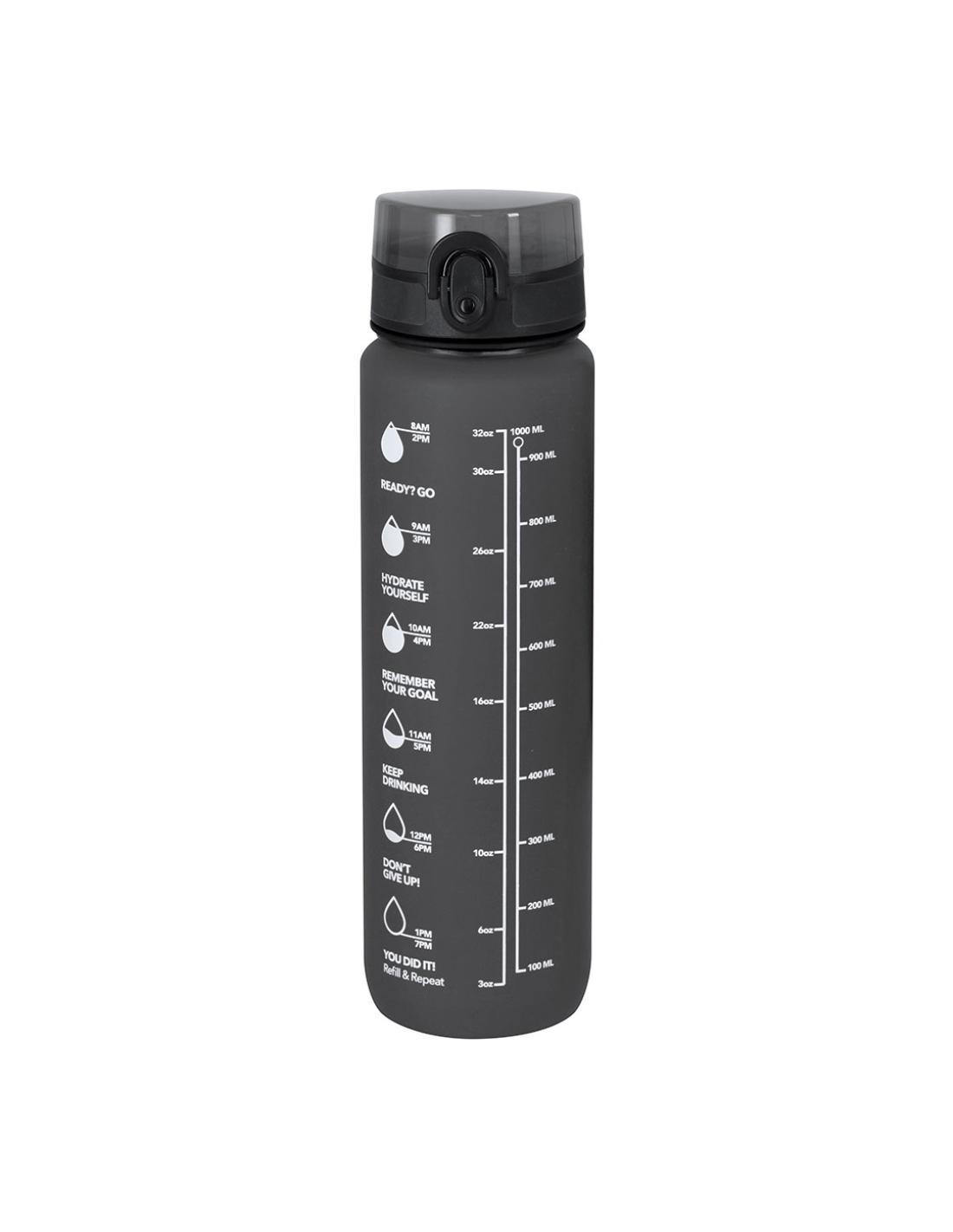 Bidón de 1L de capacidad, fabricado en resistente RPET y en acabado translúcido mate. Con indicador de capacidad en litros y onzas, junto con frases motivadoras que invitan a mantener una adecuada hidratación. Con tapón negro de rosca y tapa con capucha plástica transparente con cierre en push. Con boquilla y cierre de seguridad y cómoda cinta de transporte. Libre de BPA.