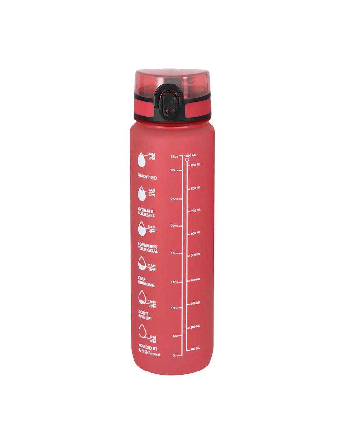 Bidón de 1L de capacidad, fabricado en resistente RPET y en acabado translúcido mate. Con indicador de capacidad en litros y onzas, junto con frases motivadoras que invitan a mantener una adecuada hidratación. Con tapón negro de rosca y tapa con capucha plástica transparente con cierre en push. Con boquilla y cierre de seguridad y cómoda cinta de transporte. Libre de BPA.