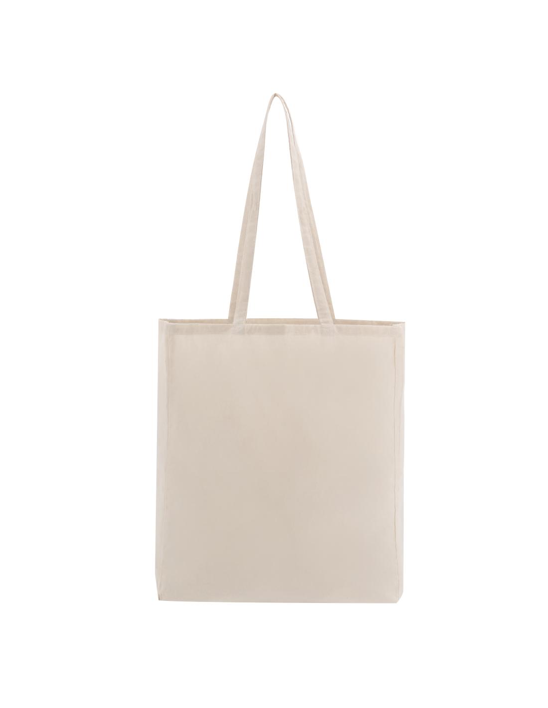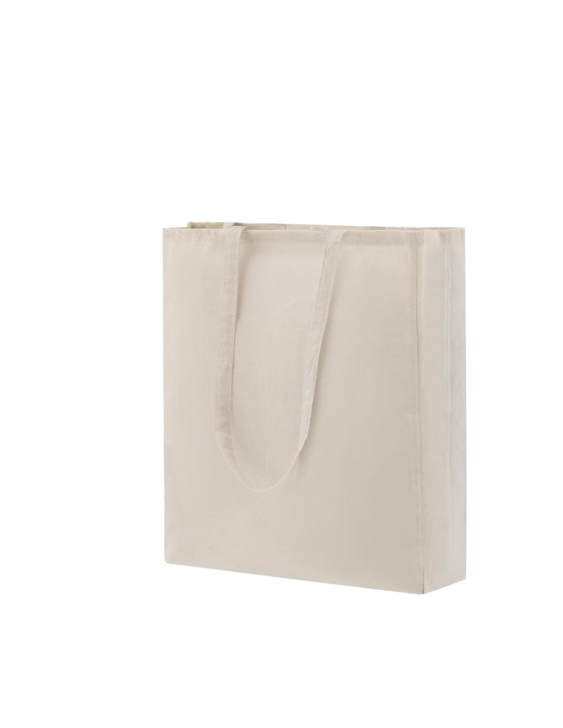 Bolsa fabricada en algodón 100%, de acabado natural y en 140g/m2. De acabado cosido, con fuelle en base y asas largas reforzadas (70 x 2,5 cm). Resistencia hasta 6 kg de peso.