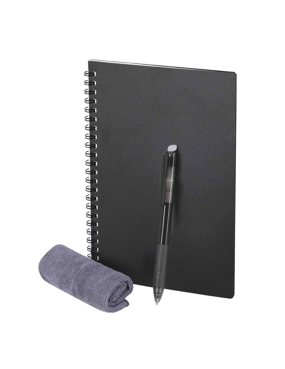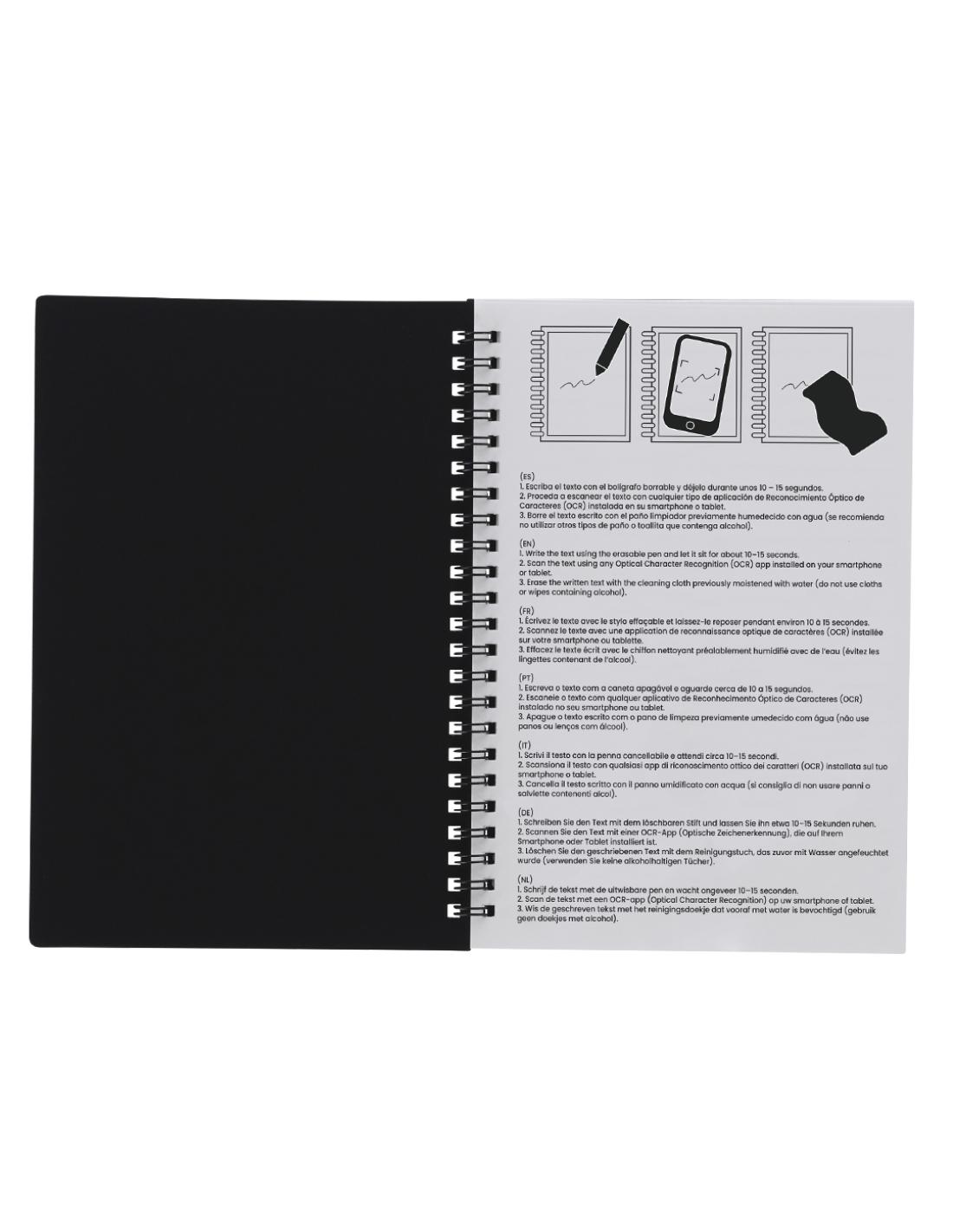 Libreta y bolígrafo borrable con paño limpiador incluido con el que disfrutar de una escritura fluida y dejar margen para el error. Libreta en PP de 18 páginas con anillas metálicas. Bolígrafo de cartucho jumbo y en tinta negra. Permite escribir, borrar y reescribir sin dañar los documentos. Fabricado en resistente ABS de acabado transparente.