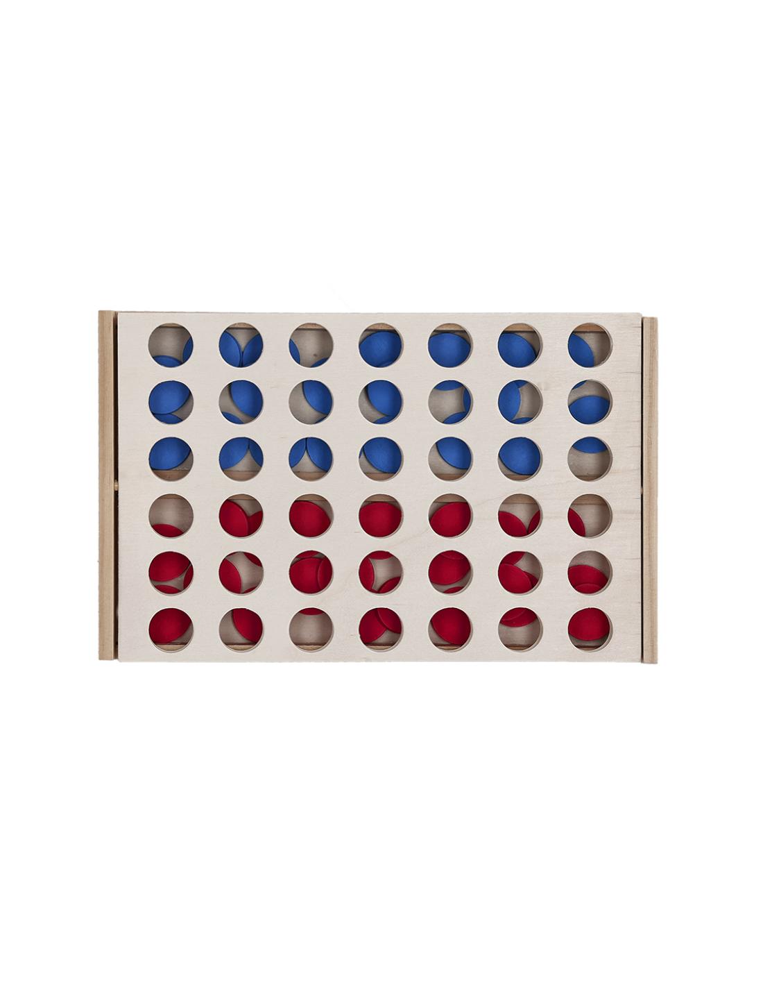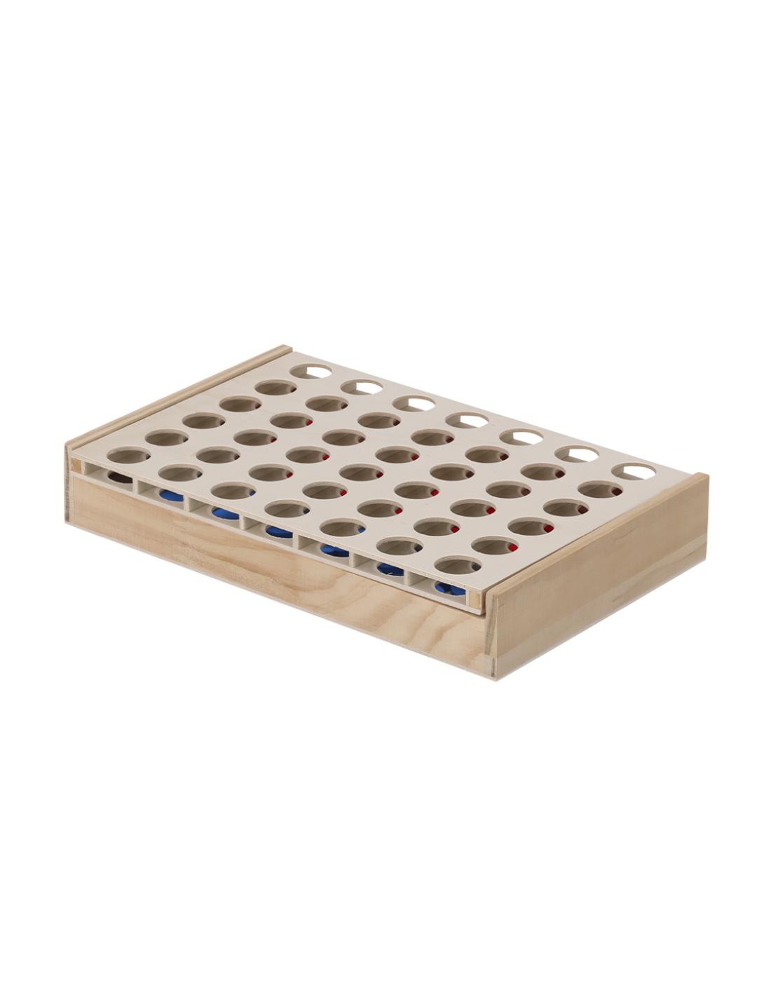 Juego de 4 en raya fabricado en madera. Ideal para disfrutar en cualquier momento, ya sea en casa o al aire libre, con amigos en familia o en eventos. Incluye 42 fichas, 21 fichas en color azul y en color rojo. Fácil de montar y desmontar, ofrece un compartimento para guardar fichas. Un juego que combina diversión y estética.