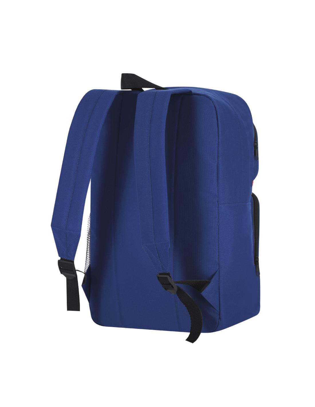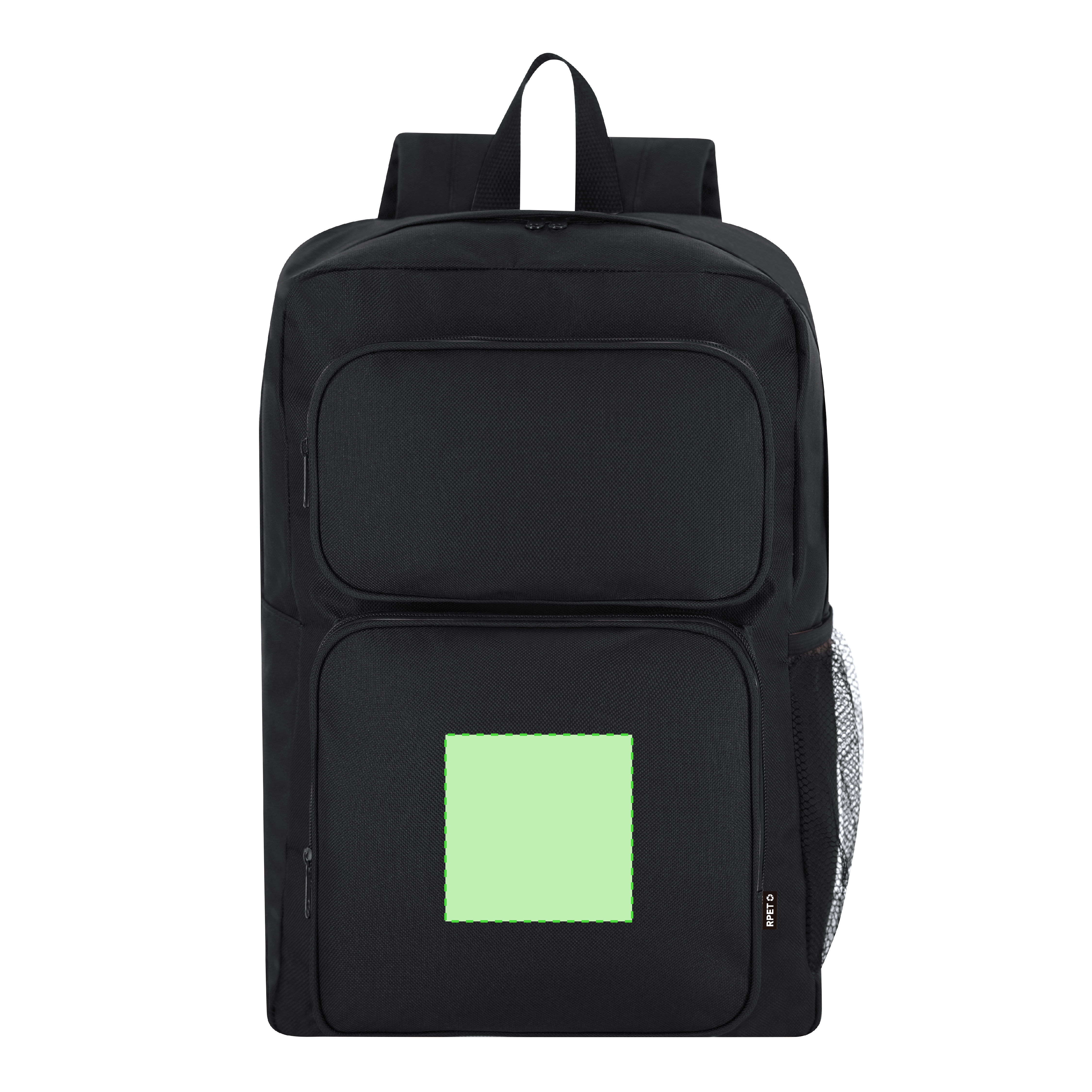 Mochila fabricada en suave Poliéster RPET 600D. Con bolsillo principal de cierre de cremallera con doble tirador metálico negro. Incluye dos bolsillos frontales con cierre de cremallera y bolsillo lateral derecho de malla. Espalda y cintas acolchadas ajustables. Con distintivo de RPET en etiqueta.