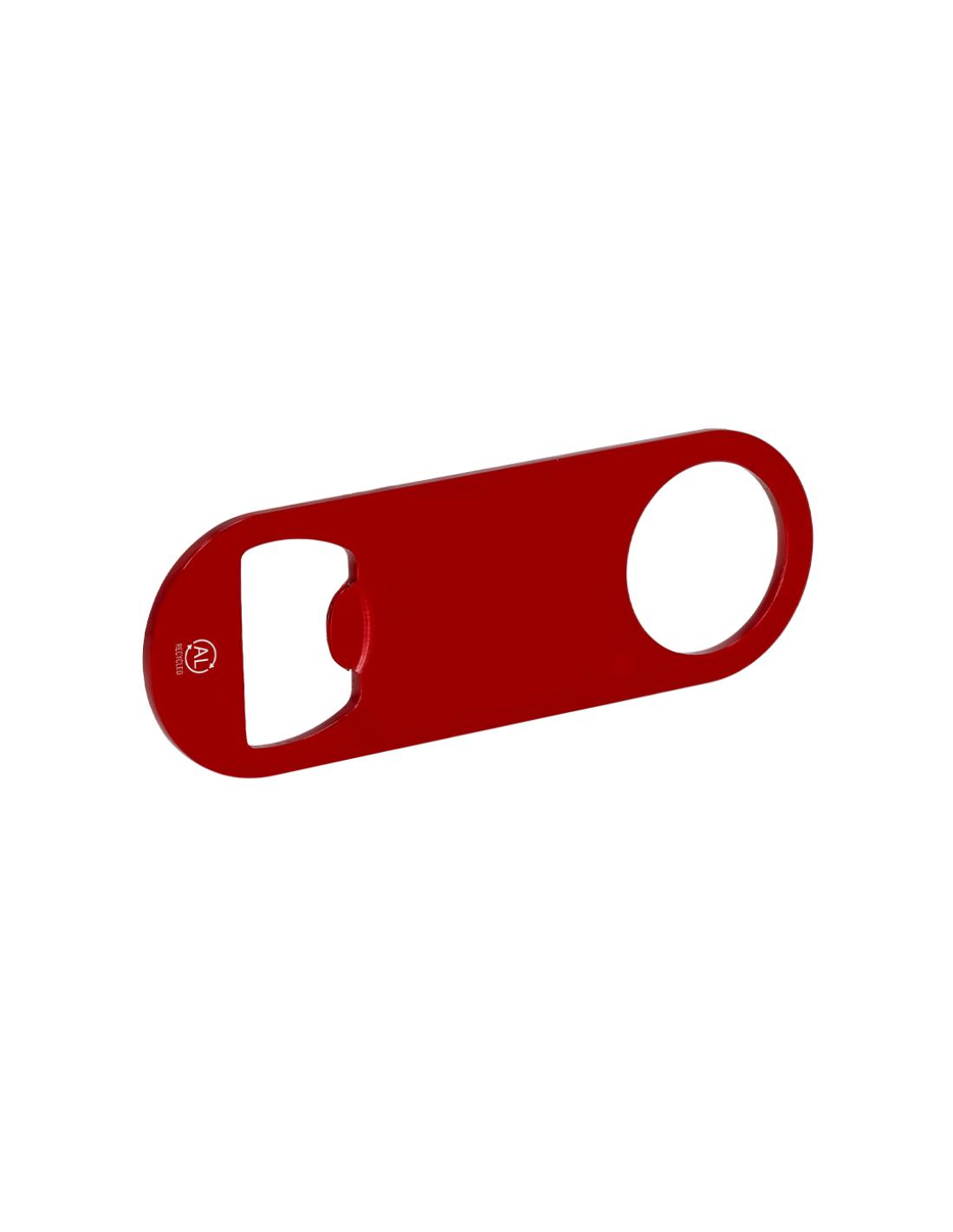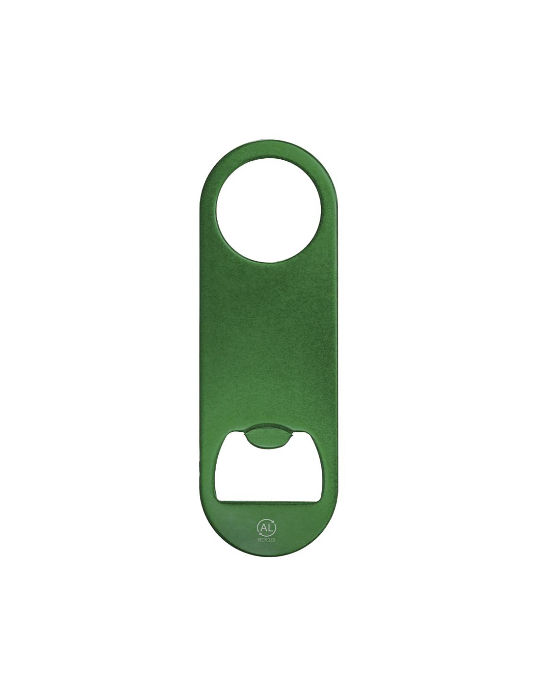 Abridor de Aluminio Reciclado con acabado metálico brillante. Un extremo con abridor de botellas y en el extremo opuesto con orificio circular de 3 cm de diámetro. Incluye logotipo Aluminio Reciclado.