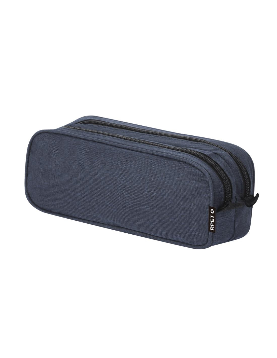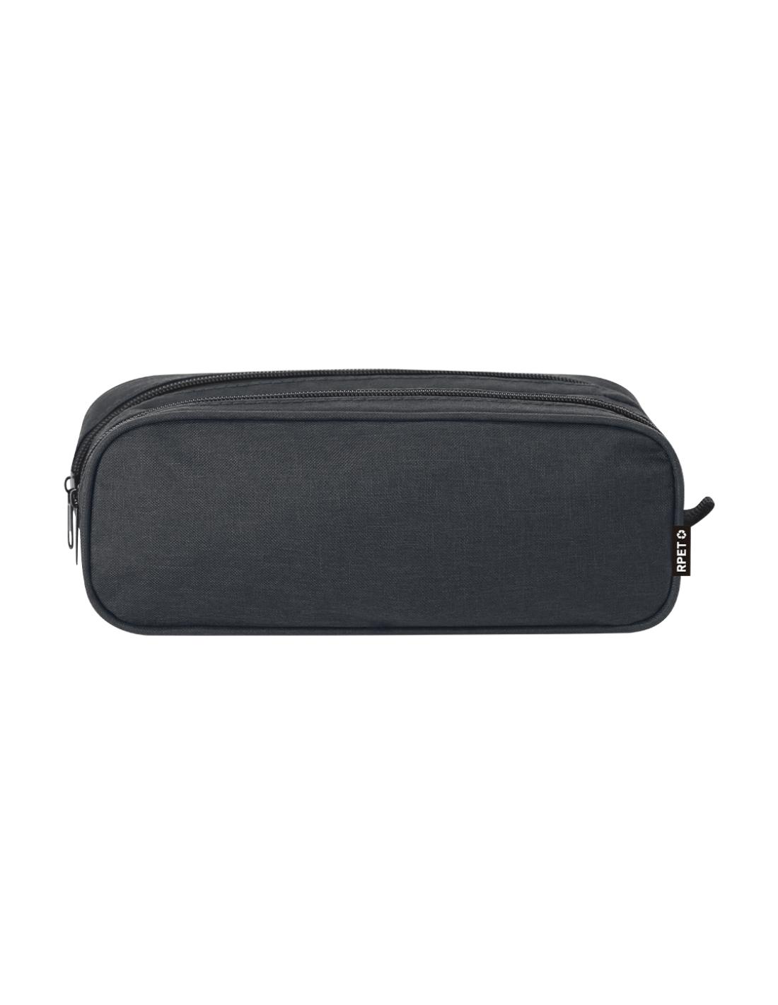 Estuche confeccionado en suave poliéster reciclado RPET 300D con tejido en acabado efecto mélage. Presenta doble compartimento y cierre de cremallera con tiradores metálicos. Incluye distintivo logotipo RPET en la etiqueta exterior.
