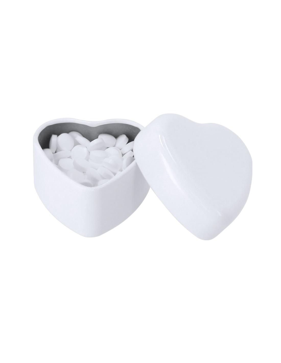 Dispensador de caramelos de menta sin azúcar de 20 gr. En caja de metal con original forma de corazón.
