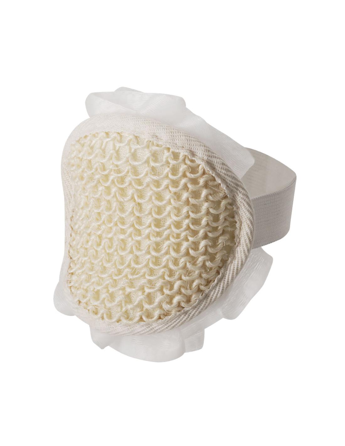 Esponja exfoliante 2 en 1 en fibra de PE. Por un lado, suave esponja y por otro lado esponja exfoliante con cinta de sujeción adaptable a la palma de la mano.